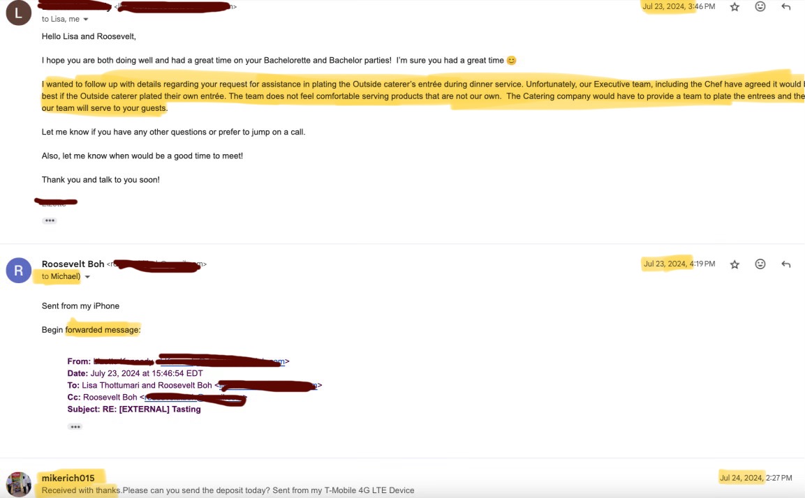 The third image is from our wedding venue, an unbiased, outside party. It confirms that, two weeks prior to the event, Michael had failed to provide essential details about Asanka Cuisine’s service for the day of the wedding. We, the bride and groom, had to personally reach out to Michael and relay the necessary wedding information to our venue ourselves.