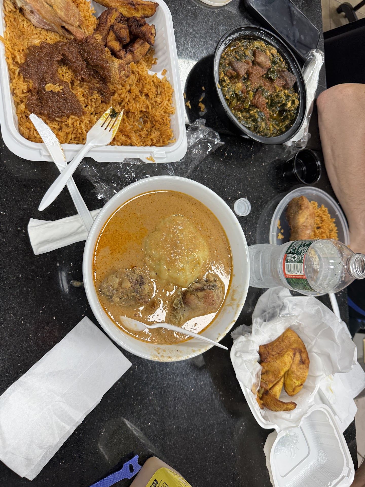 It was an absolute joy being able to eat what chef Micheal cooked up for us. Walking In, the establishment is actually in a good hall with other restaurants so you’ll want to head to the back left most stall. Chef Micheal was happy to explain his menu, dole out recommendations, and listen to preferences with food which is a level of service you don’t see honestly almost anywhere these days. We took a seat and waited a just a bit and the food was brought out. Per Micheal’s recommendation and it being our intro to Ghanaian food, we got Jollof rice with chicken, Egusi, peanut butter soup with chicken and fufu, an extra side of plantains and a ginger juice.