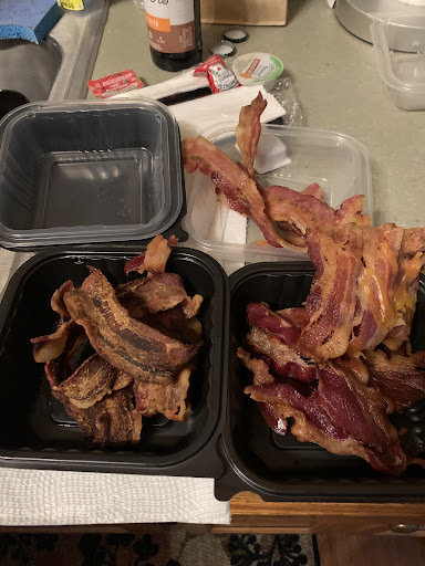 Disgusting! Our entire meal was inedible. We ordered extra bacon (see picture.) One order was burnt to a crisp and somehow cold as ice on a hot day?!? Clearly, it had been sitting around for quite awhile and they dumped it in to our bag instead of the trash, where it belonged. The two orders of bacon that came with our meals were still raw and were in the same container as the rest of our food. (Sorry, I didn’t get a pic because it was in the trash before I thought to take one.) The rest of our food had absorbed so much bacon grease and likely trichinosis that we threw everything away! The other pictured orders looked fine to eat. I love crispy bacon but it was too hard to chew because it wasn’t fresh and went in the trash, as well.