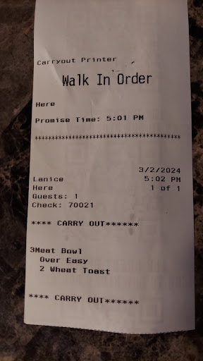 Read moreCan't keep up with Sunday breakfast rush? Maybe that's not fair of me to say. I've only been to this location once. Bob Evan's is one of my favorite restaurants; I've been to many of them, many times over the years. But this was probably one of the worst experiences, and should probably be noted: Came on a Sunday, realizing we just missed church rush, so didn't have high expectations and we're both understanding people. The hostess was sweet but had to wipe down the table before we sat, and the booth benches were dirty. The place was not completely packed. Took 15 minutes or so before greeted by server. Asked for waters and cappuccino and hot chocolate. Cappuccino and hot chocolate came without the waters, were luke warm and tasted like flavored water... Neither came stirred; all the powders had settled at the bottom. We didn't have silverware to stir it with either. Food took about an hour to come. Had to ask for silverware, waters, and refills on our drinks when the food came. Silverware and waters finally came, without straws, but no drink refills (both are supposed to be bottomless). Our food was cold by the time we dug in...it wasn't very warm to begin with. Egg whites in over easy eggs were a fair bit still runny and translucent. Steak came medium well and very dry. We'd asked for medium rare. Drink refills never came, empty cups were never taken, and we were expected to put our plates on our server's tray, cleaning off the...