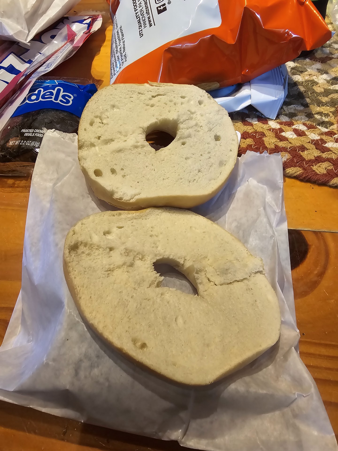 Now, the texture reminds me of a cheap way to make a bread from a box mix, airy, spongy.. It's heavy on the spices, and they've added nuts and raisins. No beautiful topping. They had a following for the old pumpkin bread. It was a beautiful guilty pleasure. Not anymore, it hit the trash can.