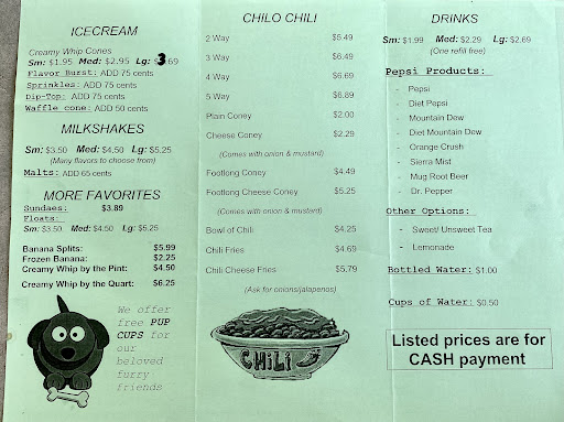 Read moreWe were out for a drive on Easter Sunday since we did not have any family gatherings to attend. We both thought an ice cream cone would hit the spot and low and behold the Chilo Dairy Bar appeared on the right. The open sign was lit and there were several motorcycles in front. We went in and were helped by the friendly staff. The cones were wonderful as we ate them in the car. While there, about three more cars pulled up and ordered. I am glad they decided to "keep the lights on". Great place for a restful and...