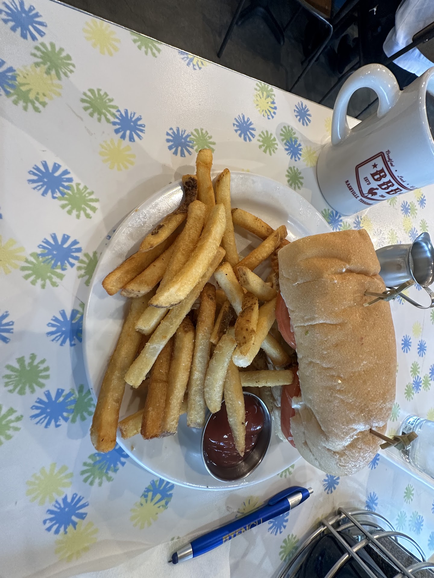 I arrived at 8:55 a.m. and was told there would be about a 15 minute wait for my party of 2, which was accurate. It took a bit for the server to come to the table. Apparently you can't order booze before 10 a.m. on a Sunday in TN, so I got an OJ which was good. I ordered the creole omlet with a "crispy" hashcake and a pancake as my 2 sides. After about a 25 minute wait, our food arrived. Pancake was luke warm, as was the hashcake, which was also not crispy as advertised. The pancake was also not fluffy, and the butter didn't melt on it. The omlet was warm enough, and I enjoyed the tomato gravy. When our server finally stopped by to ask how everything was, I told her about the temperature problems. She apologized and said she would send someone over. About 5 minutes later, the manager came and asked how things were. I told her, and said that my friend would be happy if the pancake could be microwaved for a minute. She said they make everything fresh and don't have a microwave. She also said they 'whip their butter so hard, it doesn't melt". Who knew whipped butter doesn't melt? She offered to remake our food, but at this point we had had the food for about 20 minutes and had been eating from it and so we declined. I think they might have taken some money off the bill, though I am not sure because they never said and I forgot to look at the itemized ticket. I suspect the food sat in back too long and what had been hot cooled down, though I am not sure I would have loved the pancake or hashcake even piping hot, though I know they'd have been better. I also ordered a bloody mary when 10 am came, but sadly, didn't much care for it. The base had sort of a deep, pepper flavor (not black pepper) that just wasn't to my liking. I will probably give this spot another try, maybe at a less busy time and try something else and see...