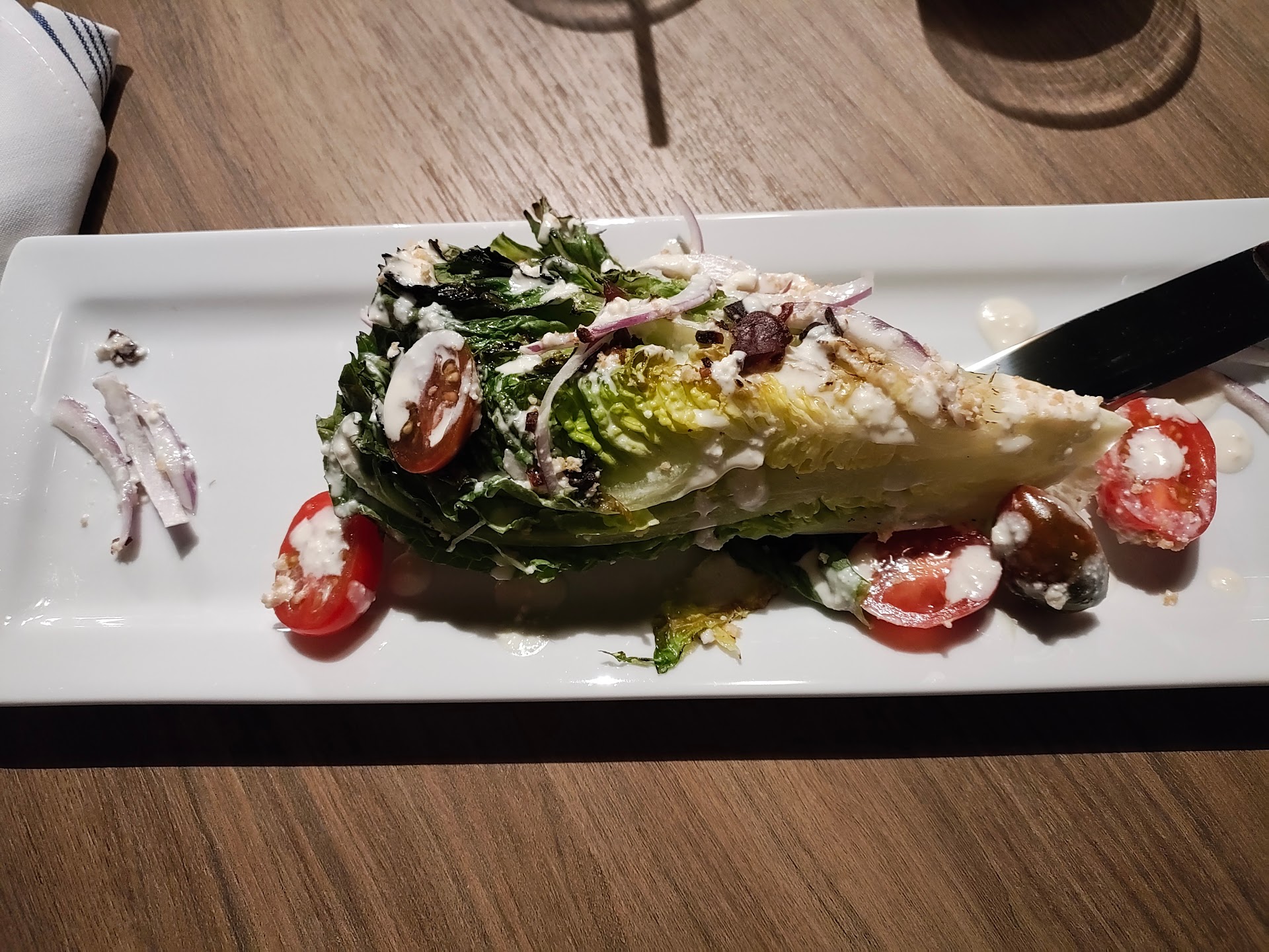 Now the food. I cannot say enough about just how delicious the food was. All but two people ordered completely different dishes, and two ordered dessert. First thing is they don't have a first course or side salad. All their salads are entrees in themselves, so one of my friends and I split the Wedge Salad so we could have our first course but not eat too much before our mains. In our group we had Chicken Parmesan (x2), Pizza, Calzone, Chef's Choice Ravioli (which last night was Burgundy Glazed Beef Ravioli in a Creamy Mushroom Sauce), and I had the Braised Short Rib. Everyone absolutely LOVED their choices. The braised short ribs with garlic mashed potatoes and spinach was just divine. The meat just melted in my mouth. The mash was so smooth without being over-whipped, and the flavor was just...
