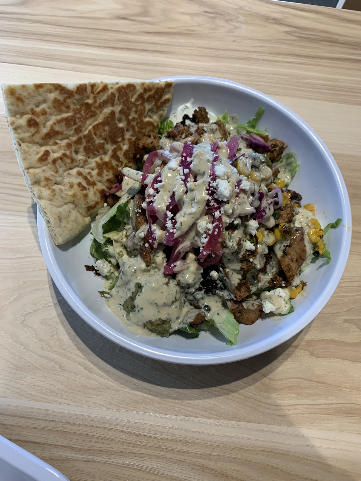 Read moreAtmosphere wasn't bad but the food and staff were hideous. Can I give 0 stars? The food is genuinely the worst my husband and I've had out to eat...possibly ever, definitely in a long time. We did a pickup order via the app. Some things were over cooked (mushy veg, shoe leather steak, falafel was stale), almost every ingredient had a strange chemical taste, others beyond over seasoned. Nothing cohesive flavor wise. Avocado was completely brown, not from heat, but from the little brown vein/streaks over the whole thing. I don't know anyone who would serve, much less eat, an avocado like that - the flavor is terrible. Felt like I was taking shots of vinegar with the pickled onions. And I LOVE pickled onions and vinegar. I held hope for the pita, just to realize they didn't give it to me...and I double checked I had added it to the order. Overall the meal left me feeling like my mouth had been assaulted from every angle.