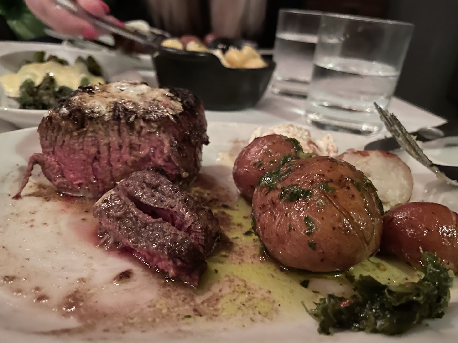 Dinner: COLD..... Our reservations were at 830pm, we got sat at 9pm, dinner came out at 10pm. Getting drinks was a chore, we had to continue to remind the "waiter" that our drinks need fill and our sides had been forgotten. We ordered 3 filet and a ribeye. 3 cold ribeyes (the butter would not melt on top of the steaks) and a ribeye textured like a rubber shoe sole. The waiter asked if all was OK, I informed him of my dislikes and I did not want my steak taken back. My intent was to give it to the dogs at home. I certainly did not want to wait another hour for a mediocre steak to only be made more unhappy. Our sides, "risotto" was like Vietnam soaked rice texture, "gnocchi" was like a half cured glue tubes seasoned in pocket lint. "Broccolini" was MIA and when we reminded the waiter of our order. We received 4 greensticks. Cold as if they pulled out the can opener and poured out the contents onto a cold plate.