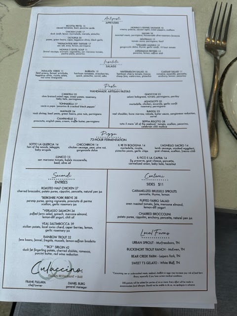 Read moreCulaccino did not disappoint! I was in town visiting a friend that brought me to Culaccino for dinner on Friday night and it was one of the highlights of my trip. I wish I had pictures of our food, but we ate most of it before I thought to get some. However, I did manage to snag pictures of the menu and outdoor seating area. Lainey was our server and was very knowledgeable and friendly and we sat outside on the patio since the weather was perfect. I was very impressed with the open kitchen concept and I did not find the restaurant to be too cramped or loud as other posters mentioned. I had two cocktails I enjoyed during dinner, Thyme and Thyme again and Smoke and Mirrors. Both were fairly priced and delicious, but the Smoke and Mirrors was by far my favorite. We then ordered the Asparagus fritters for an appetizer in addition to their complimentary fresh bread and homemade ricotta. I debated on my entrée for over ten minutes and discovered that I could do a small plate of ravioli in addition to my veal saltimbocca since I could not decide and they both sounded amazing. While the veal was very good and I would order it again, I wished I had ordered a full plate of the ravioli. They were perfectly cooked and the sauce was mouth watering. I even sopped up the rest of the sauce with some of the complimentary bread. One of my friends ordered the Cavatelli pasta which we were told is a restaurant favorite and the other debated on pizza, which she has had before and loved, but decided to go with their Rigatoni and wild boar special of the day. They both also enjoyed their meals, but I was enjoying mine too much to get the details. We decided we would come back later for dessert after walking around downtown for a bit. When we came back, we sat at the bar and I ordered gelato and my friend ordered the Tiramisu. I am not usually a fan of tiramisu, but theirs was unlike any I have ever had and I really enjoyed it and had a hard time keeping my spoon out of my friend's dessert. My gelato was also very good and we all enjoyed a glass of wine to compliment our dessert.