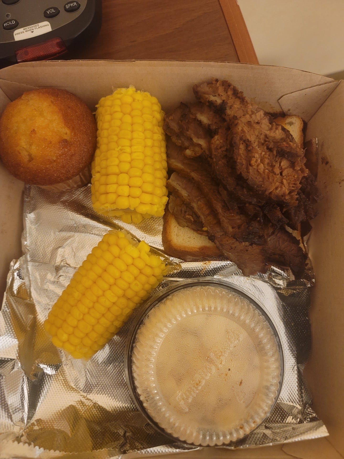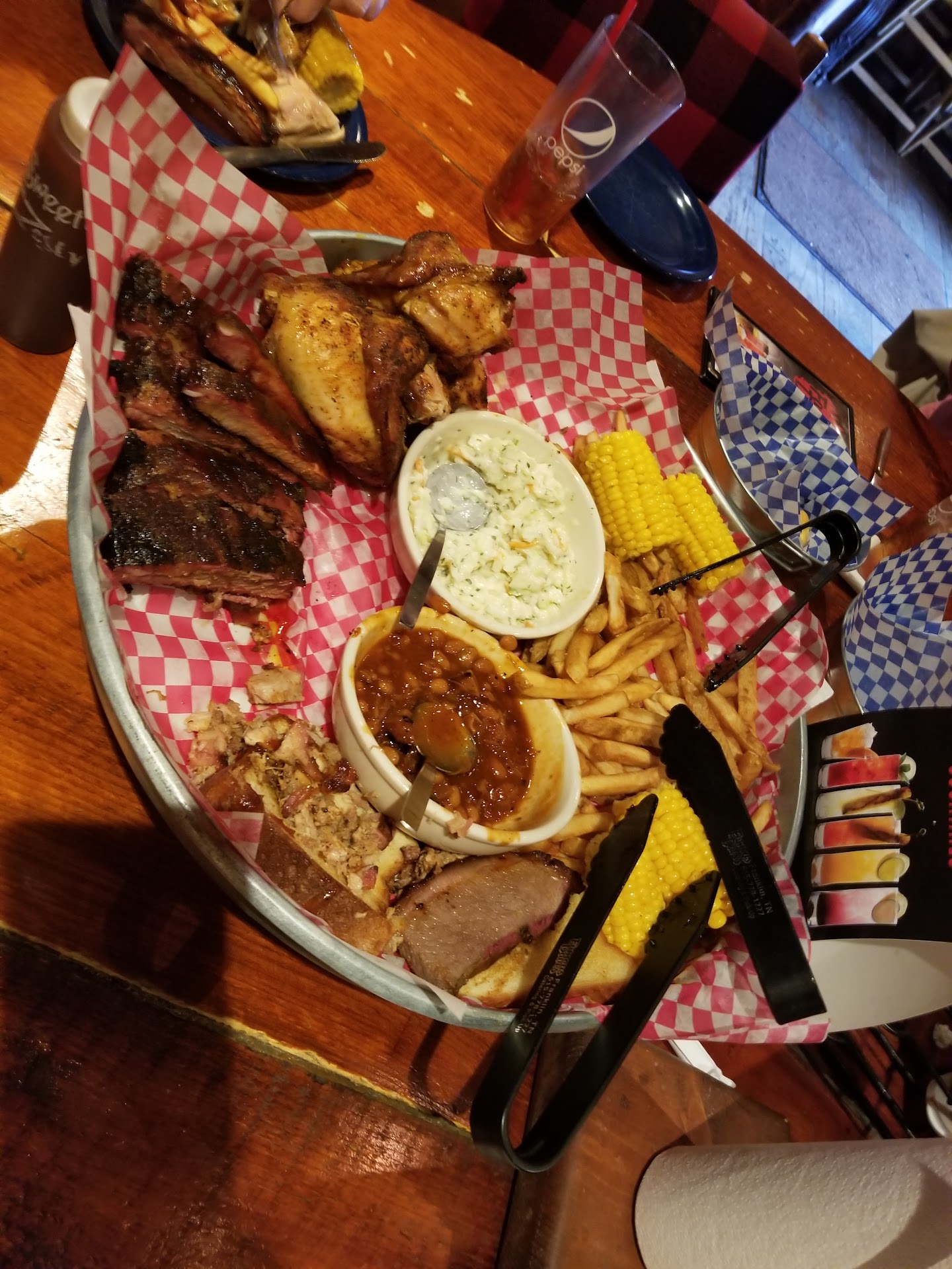 Ā Ā Ā Read moreShared a big platter for our Christmas office exchange party. The ribs and brisket were amazing with the different sauces. I loved the ribs even without sauce. But overall as a meal, I felt that your whole plate including the sides has to be great in order for me to rate it a 4 star. A 5 star would mean an amazing meal and flavorful that I would have nothing to complain about. With that said, the chicken was super dry that I had to eat it with the beans and slaw. Wasn't really a fan of the beans nor the slaw since it's so sweet. The corn is just corn. The cornbread served at the beginning was great. Very flaky and not too buttery, just enough sweetness as well. The fries served was just basic, I don't even know if it deserves any attention. Overall, I would definitely come back but only for the ribs and brisket. The other stuff, I...