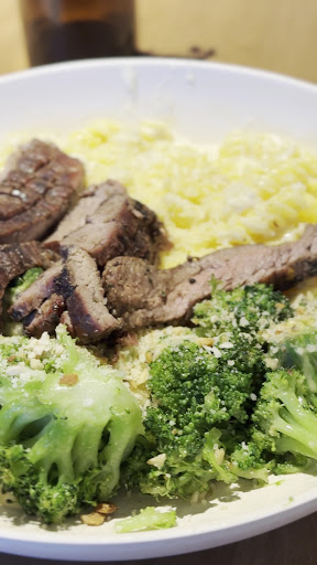 As for the meal, the steak was not the star—it was a smaller portion, lightly seasoned, and mostly cooked well-done, so if you prefer a medium or rare steak, another protein option might be better. The gluten-free macaroni and cheese was creamy, flavorful, and a great pairing with the steak. The true highlight was the roasted broccoli, which had a zesty, citrusy flavor with a hint of cheese, perfectly cooked with crisp-tender centers and slightly roasted ends.