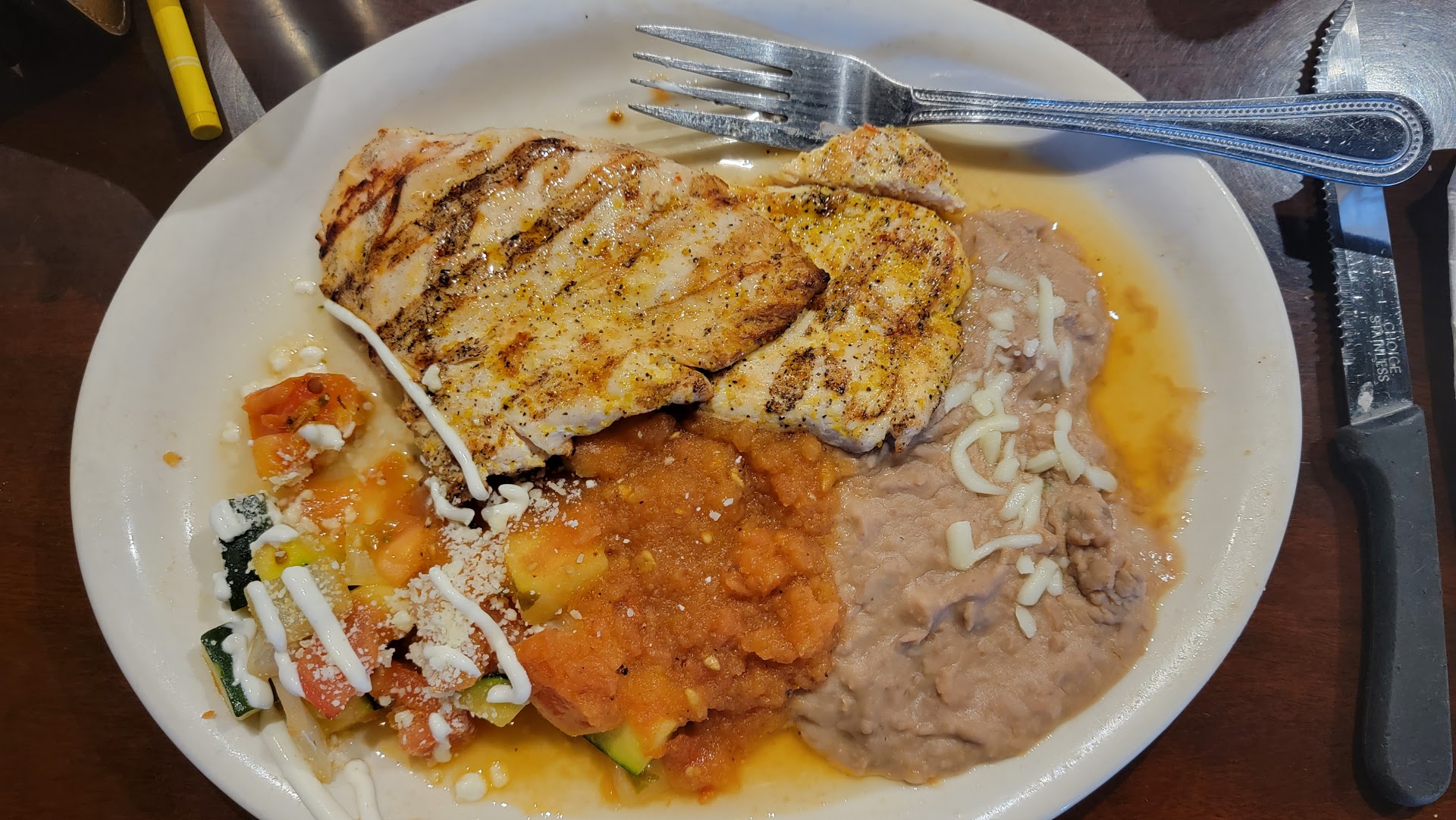 I love the pork enchiladas, guacamole, Pollo a la Parilla, and tequila lime chicken that is served with grilled veggies.