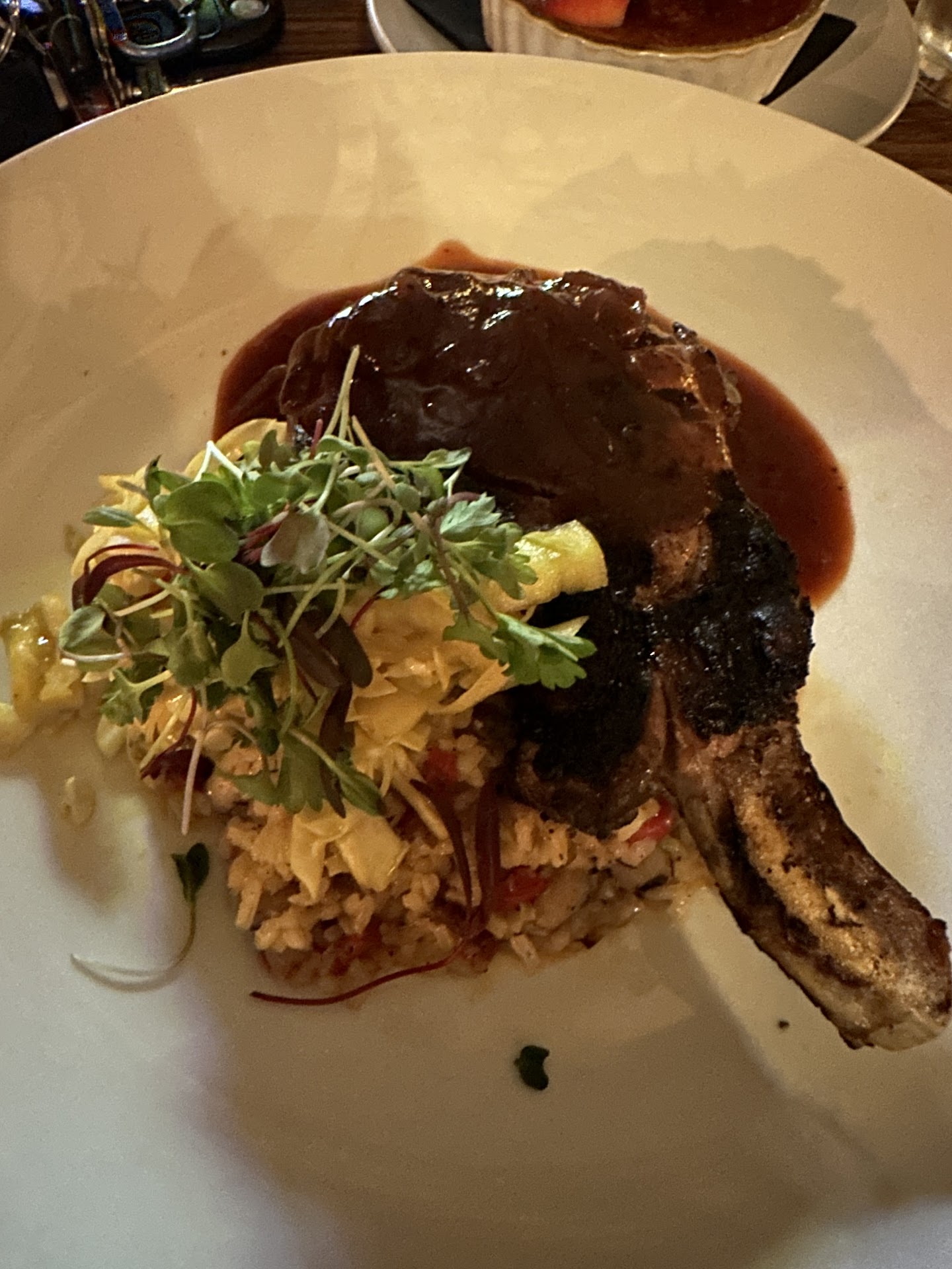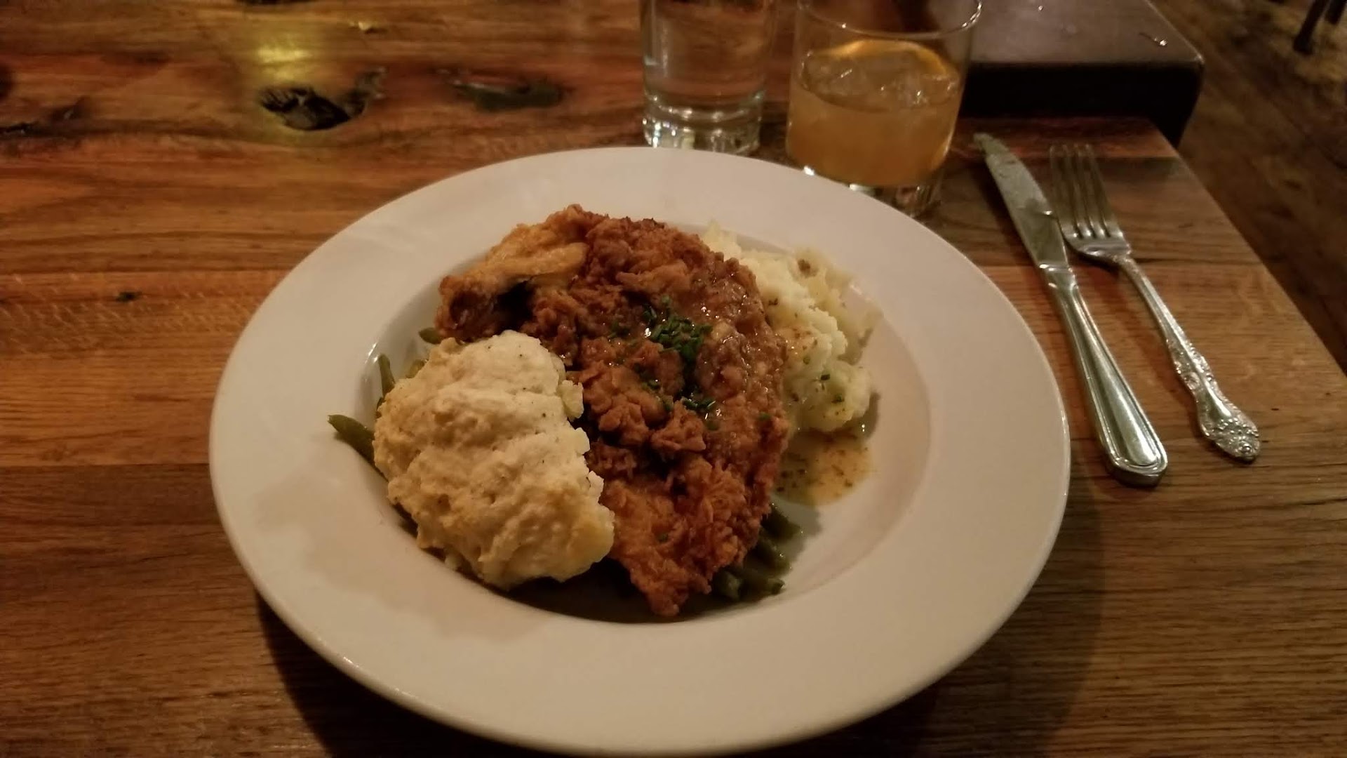 THE FOOD: If you want delicious and thoughtful Southern cooking, with the portions to match, then this is the place for you. For appetizers, we ordered Fried Pimento Cheeseballs (SO GOOD), Bacon-Wrapped Figs (melt in your mouth delicious), and Brussels Sprouts Trio. My favorite by a good margin were the Fried Pimento Cheeseballs - who doesn't like fried cheese?? They were lightly drizzled with a moonshine pepper jelly which gives a unique flavor of the moonshine with the bite of the pepper, without being overpowering. The Bacon-Wrapped Figs just melt in your mouth and have a wonderful rich taste. I personally am not a fan of Brussels, but these were actually pretty tasty and I wouldn't mind ordering them again. If you like Brussels, then you will probably love the ones here. (All 3 apps pictured together)