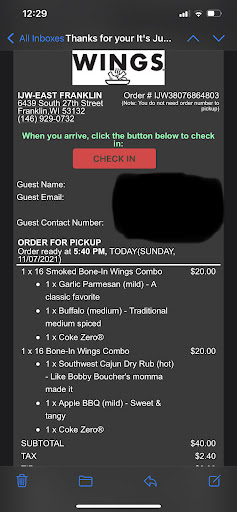 Read moreI ordered delivery before and it was amazing! So I am so sad that I can't leave an amazing review today. I ordered pickup and sat outside for an hour past when my pickup time was scheduled for. The doors were locked no one from Chili's or It's just wings would answer the phone. No signage that they weren't open. The Packers were playing on the tvs inside. They did charge my account for nearly $100 though. Several other people came and left to get orders too. So I imagine this isn't the only angry review today.