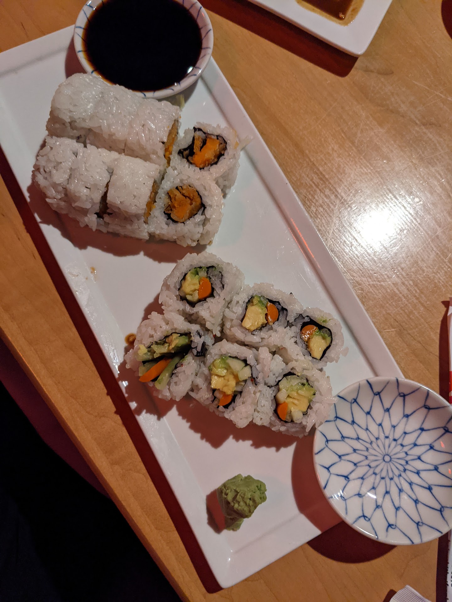 I ordered takeout and picking it up was no problem at all. The inside of the restaurant looks very nice and I was surprised by that because it doesn't really look like much from the outside. They have a sushi bar seating area and even had Asian-style tables that are low to the ground with room beneath the table so you can sit normally. I really liked the atmosphere.
