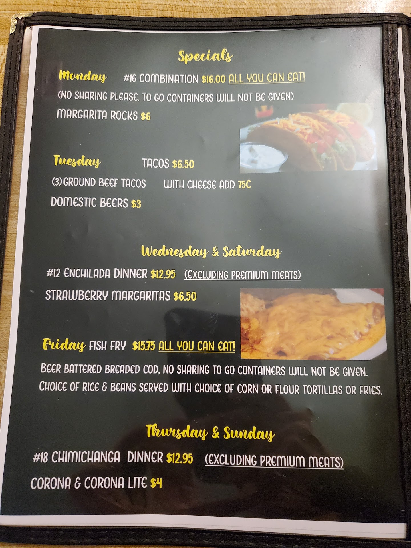 Read moreWe've driven by here hundred of times and finally decided to give this authentic Mexican restaurant a try. It's small inside. There is a small bar area. We got there about 5:20pm on a Wednesday night. There were about 5 or 6 tables open at that time so we got seated right away. They had a sign up letting people know that they will be opening a 2nd location soon. 3040 S. Delaware Street near Bay View. Our waitress was friendly. She brought our chips and they were too hot to eat right away. Fresh out from the fryer!! There's 2 salsa bottles on the table. A red salsa that they said was hot but seemed mild to me. Also a mild green salsa verde. Both were good but I especially liked the verde. The menu is large. They do have daily dinner specials. For dinner we ordered the combination fajitas. Steak, chicken and shrimp. The steak was tough and chewy, honestly, not even edible. But the chicken was good! A little over cooked but still had a good flavor and the shrimp was good. It had a mix of grilled veggies. Green and red pepper, red onion and chopped tomatoes. It also came with a side of rice and beans. The 2nd dinner was the Red Snapper. I wasn't expecting it to be the whole fish but after the initial shock wore off, it was very good. Again, a little over cooked but good flavoring. Both dinners came with warm flour tortillas. With the fish, there was a side of rice and garnishings for the tacos. Lettuce, tomato, raw onion, sliced avocado and lime wedges. My fajitas were suppose to come with guacamole but the waitress never brought it and I ended up forgetting about it until I was just about done and by that time it was busy so I said ill just try it next time. We didn't try any drinks from the bar but I did see they have a daily drink special. We both ordered Coca-Colas. While we were eating we did notice a couple of flies flying around but it has been hot outside and the door opens quite often with people coming and going so not really a big deal, just annoying. We would definitely stop back for dinner again. We will have to check out that...