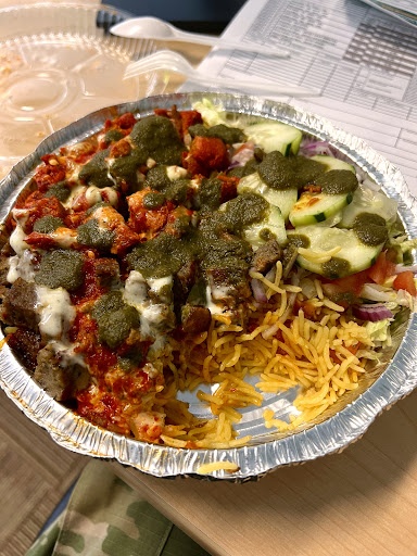There's a lamb or chicken or a mix over rice. I really can't recommend it enough. Amazing in every sense of the word! It's got a little kick to it, I'd say medium level spice. Nothing too bad, but I loved it. The meat was juicy and flavorful. I loved every single bite and just wanted more.