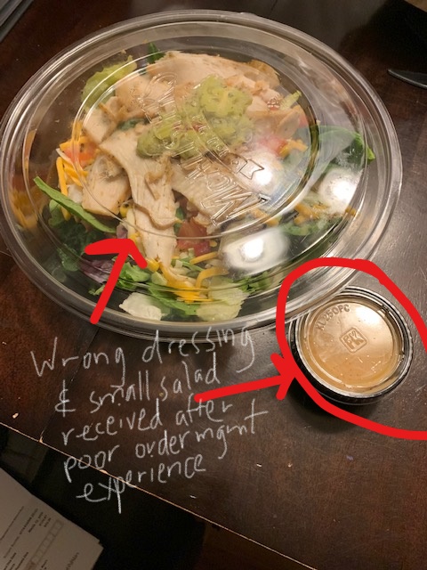 To set the scene... tonight was NOT a dine-in night, my mission - order two items with minimal accommodations (Cobb salad - bleu cheese dressing on side, no bacon; Just a Spud - add bacon, add cheese), pick up, and continue with our Sunday evening.