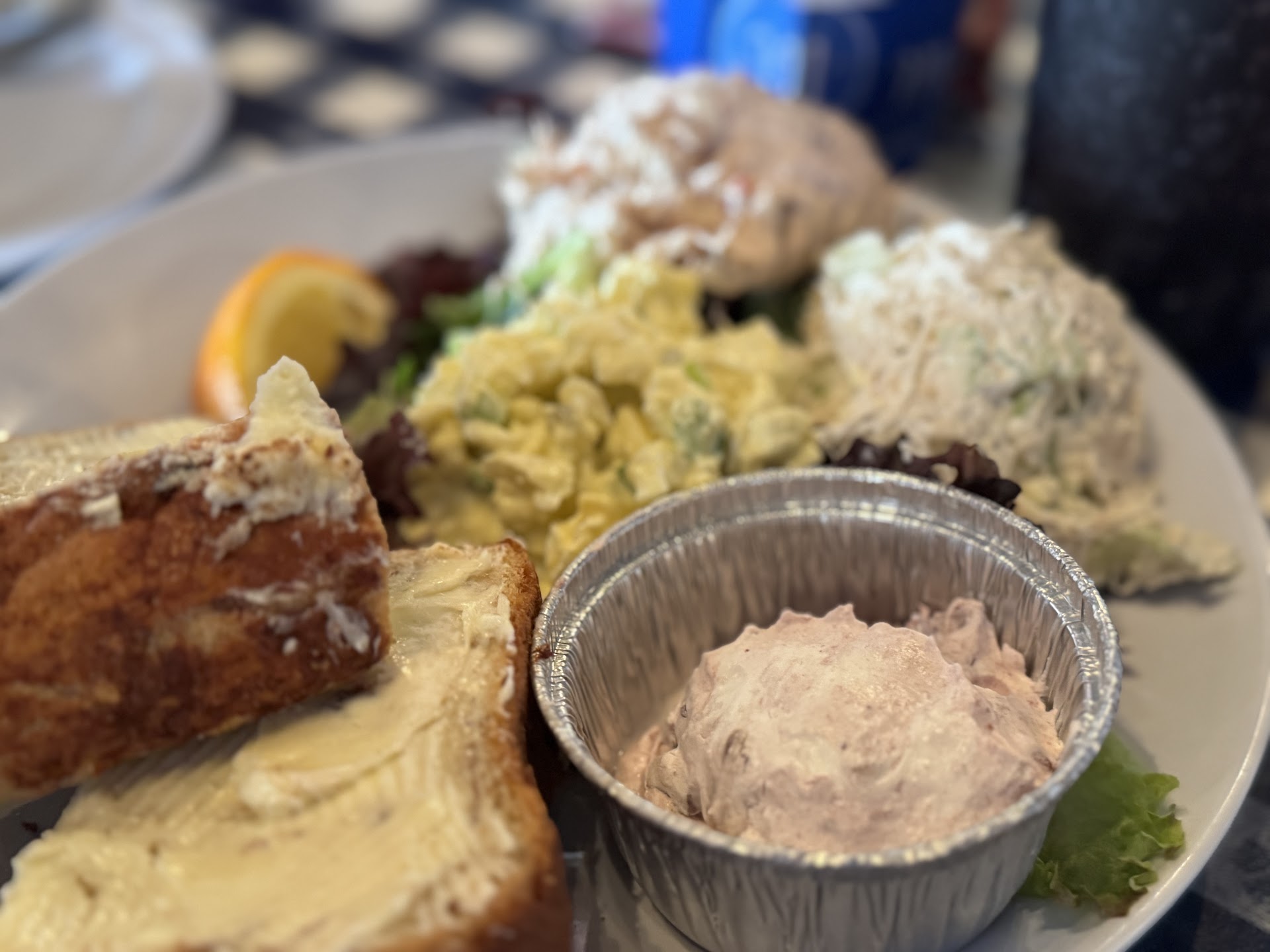 The salad samplers came with chicken salad; cold, Flavorful with chunks of celery, tuna salad, sort of bbq-Smokey-in a good way, and the egg salad reminiscent of grandma’s. These came with their homemade bread and cinnamon bread and butter. These came cinnamon bread was out of this county good. The salads also came with a small tin of ambrosia! Surprisingly good too.