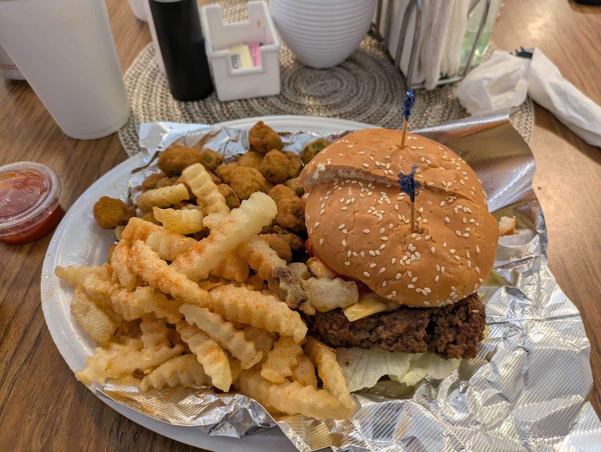 Read moreMan this place is awesome! Occasional like to find out of the way family run restaurants, and this one was an awesome find. Walked in, immediately greeted by the staff, and seated. Pretty simple menu of comfort foods. I had the cheeseburger, and my wife had the butterfly shrimp. Killer fried okra. The service was simply incredible. The food was even better than the service. Just a local little place out of the way that you have to go. One of the...
