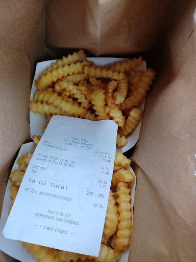 But, Shake Shack Franklin is going to a lot of growing pains. Not sure, if it is due to the national labor shortage, but it can literally take 45 - 1 hour to get your food here. I've ordered here about 8 times - first time being the first week they opened. I know now, not to order there unless my kids really insist and I have 90 minutes free. They need to be upfront with customers on the potential wait time, as I always see an angry mob of customers there. A couple of weeks ago, I saw the grill staff with their backs to the grill - laughing it up - while there were tons of people lined up waiting for their orders. Also no one manning the drinks and shakes station. I went back for 2 shakes for my kids a couple of days ago, and the entire staff was heads down, and there were 2 girls at the drinks/shake station. So, they may be get their act together, but I still needed to talk to them after waiting 20 minutes, so I could get my shakes expedited. She quickly made my shakes and I was appreciative.