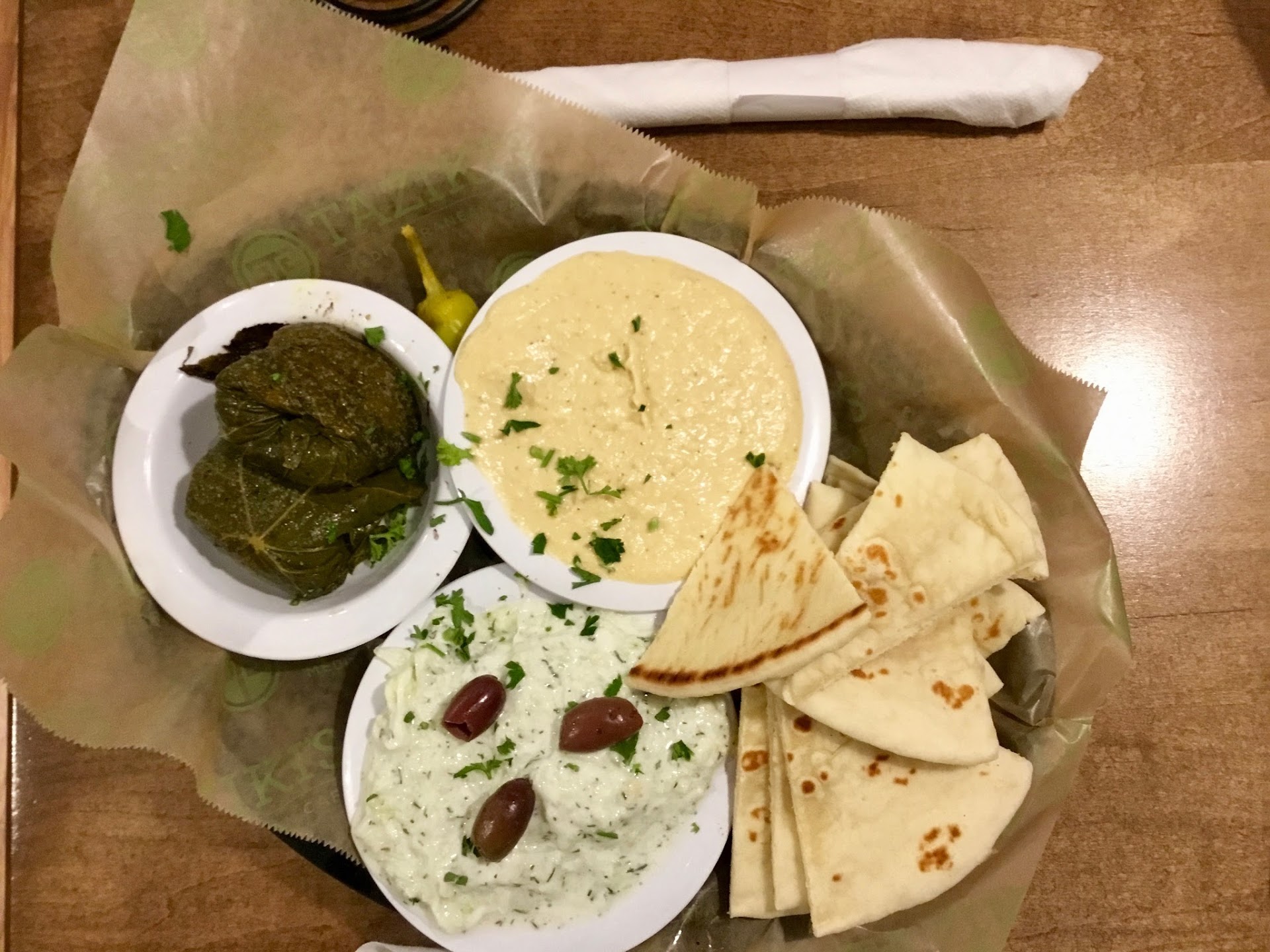 If you're a fan of dolmades, then Taziki's is definitely worth trying. They're legitimate dolmades - served warm, and made in house. These aren't the canned dolmades, or Whole-Foods dolmades that come soaked in oil... these domades are plump, warm, and delicious.