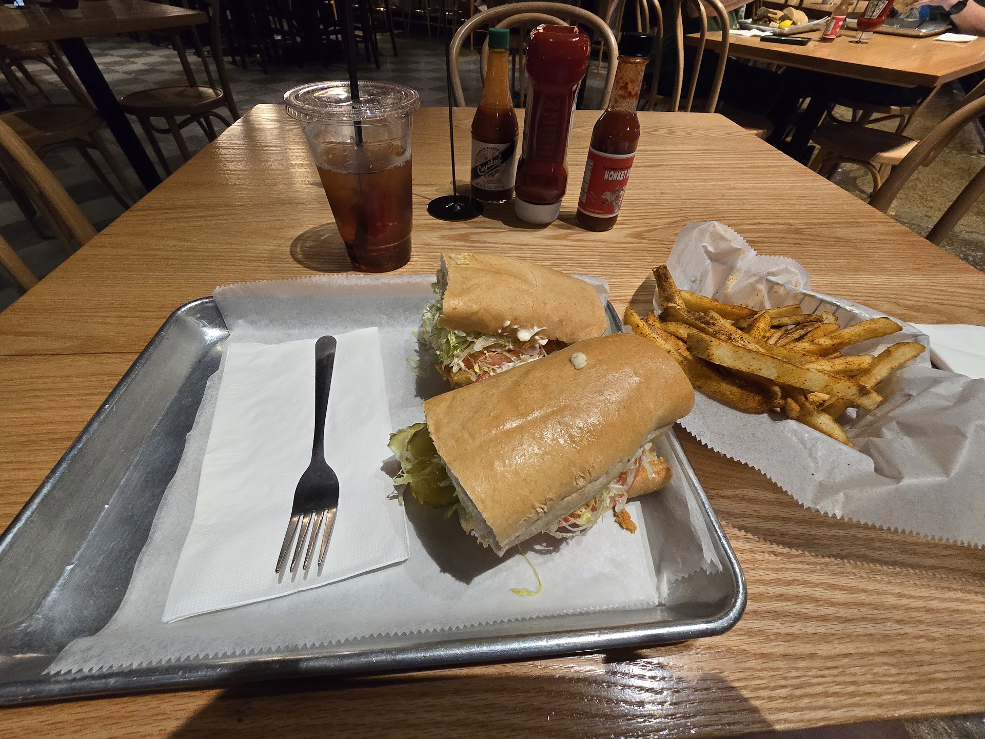 Read moreWent yesterday evening at about 5:30. There was a long line out the door. I guess you order your food at the front counter, then take a seat, and your meal will be brought to you. We skipped that step though, as there were 4 seats together at the cocktail bar. Both bartenders were very very attentive. The leading bartender said this was the slowest night they'd had since they opened and yet almost every single seat in the restaurant was taken. I had one Frozen 75 - a mixture of lemon, gin, and champagne and it knocked my socks off!! So SOUR but so delicious and got a great buzz. My partner ordered the alligator po boy. He said it was good and finished it, but $18 for a sandwich with NO SIDE was too expensive. A side of fries was $7 and was split between him and the two other people we were with. My fried catfish platter however was incredible. The Cajun fries 10/10. Hushpuppies 11/10. I didn't care for the salsa/sauce that came with the hushpuppies but the white sauce that came with the fish was phenomenal. I was a tad thrown off at first - being served 4 little twisted up pieces of catfish when I'm used to seeing huge fried filets but it was soooo good. I thoroughly enjoyed my meal and for just a few dollars more than the po boys, I think it is a better value. The vibe at the bar was just great and I'd love to go back soon, even if to just grab a drink and then wander...