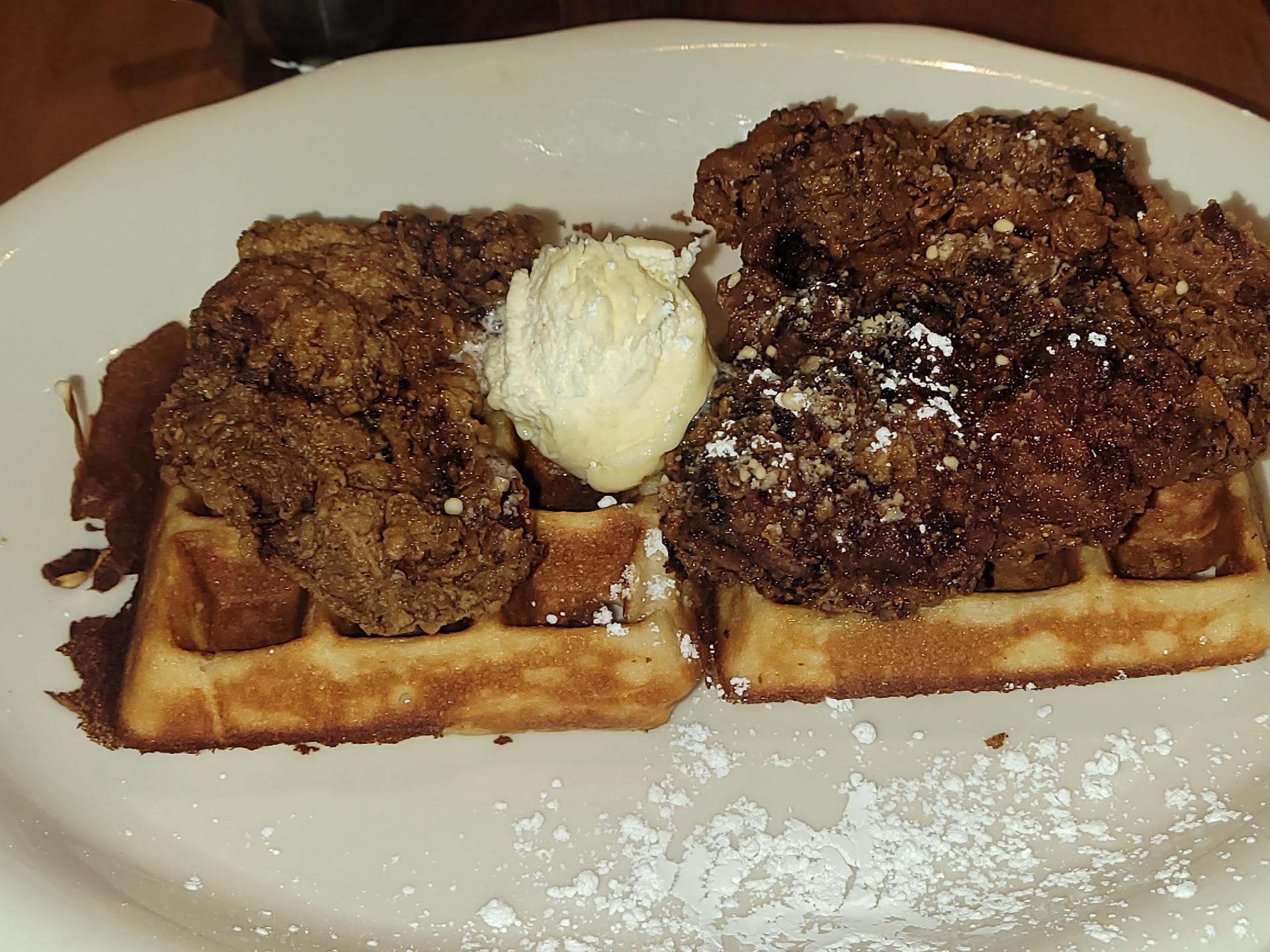 Food: Ok, I ordered the regular Chicken & Waffles, my wife had the Sriracha Chicken & Waffles. I like to have the regular Chicken & Waffles, this gives you a better understanding if a restaurant truly knows how to cook/ throw down Chicken & Waffles and be creative. The Waffles are 2 small squares with a piece of chicken sitting on each square waffle. The Crust looked good dark brown almost like a rub. I really wanted this to be good. And butter on the plate with thier house brand syrup.
