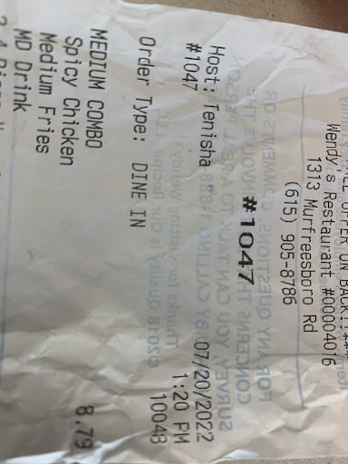Read moreIt was quick and easy to order. I had #8 I believe it was a baconator meal large with Sunburst Melon lemonade and it was less than $15. But I have to say it was quick and the lady taking orders handing out the orders getting drinks and taking money was so kind and very pleasant nor did you feel rushed and she was very polite. She deserves kudos. I went there at the Franklin one 7/20 at 12:30 ish so lunch crowd. Now the food mmmm I love there hot crispy fries they BEAT McDonald's hands down to me. Now the hamburger actually was bigger than you hand, there was cheese that you can see and yes people it was melted also.(I know that is a new concept đ) Plus there were actually REAL strips (and I do mean actual strips) of bacon that covered the burger. It hot juicy and delicious like a burger should taste and on a scorcher of a day we were having 98 degrees in shade that lemonade helped quench my thirst. No I don't, didn't or haven't worked for Wendy's but it was worth the high prices that everyone...
