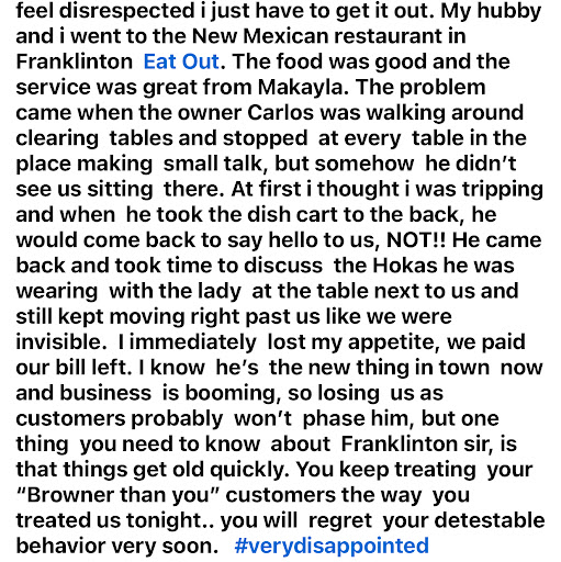 Local of Franklinton here. "Eat Out" is my go to restaurant. I Love the staff and environment. I have eaten at "EAT OUT" many and many of times. The Owner Carlos is a great guy and I love supporting his place of business. He has given my 4 kids free ice cream in the past no extra charge and I have other examples of his kindness. You would not recognize he's the owner as he is bussing tables and making mixed drinks. Business wise they are newer and are working out the kinks which they have done over the last year wonderfully. Their service and food have improved though the months and honestly it was not bad to begin with. They are fair in pricing and if there are any discrepancies (ALL RESTAURANT WILL HAVE) they promptly fix the issues. Their Mexican food is great and I prefer EAT OUT opposed to their competition which I don't find them to...