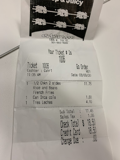 Read moreMy family and I eat here regularly and I have been a fan of Crisp & Juicy since the 90's, (Leisure World and Rockville). This was the original Peruvian style chicken place. The food at each C&J is great, but this store is surrounded by other stores of interest, a bar across from it, a public park and playground just on the backside of the shopping center, banks, and us right off of 15. The staff are friendly, they provide you whatever you need to enjoy a dine-in meal, and if it is to go, they pack it right to ensure there isn't any spillage. A side note, first taste just the chicken. Then go back and buy a whole chicken, then cut it and use it in various meals/dishes for adults and kids! On salads, chicken alfredo, chicken wraps, chicken primavera, and more! The food is definitely worth every dollar, and the peacefulness of the store, despite surrounding...