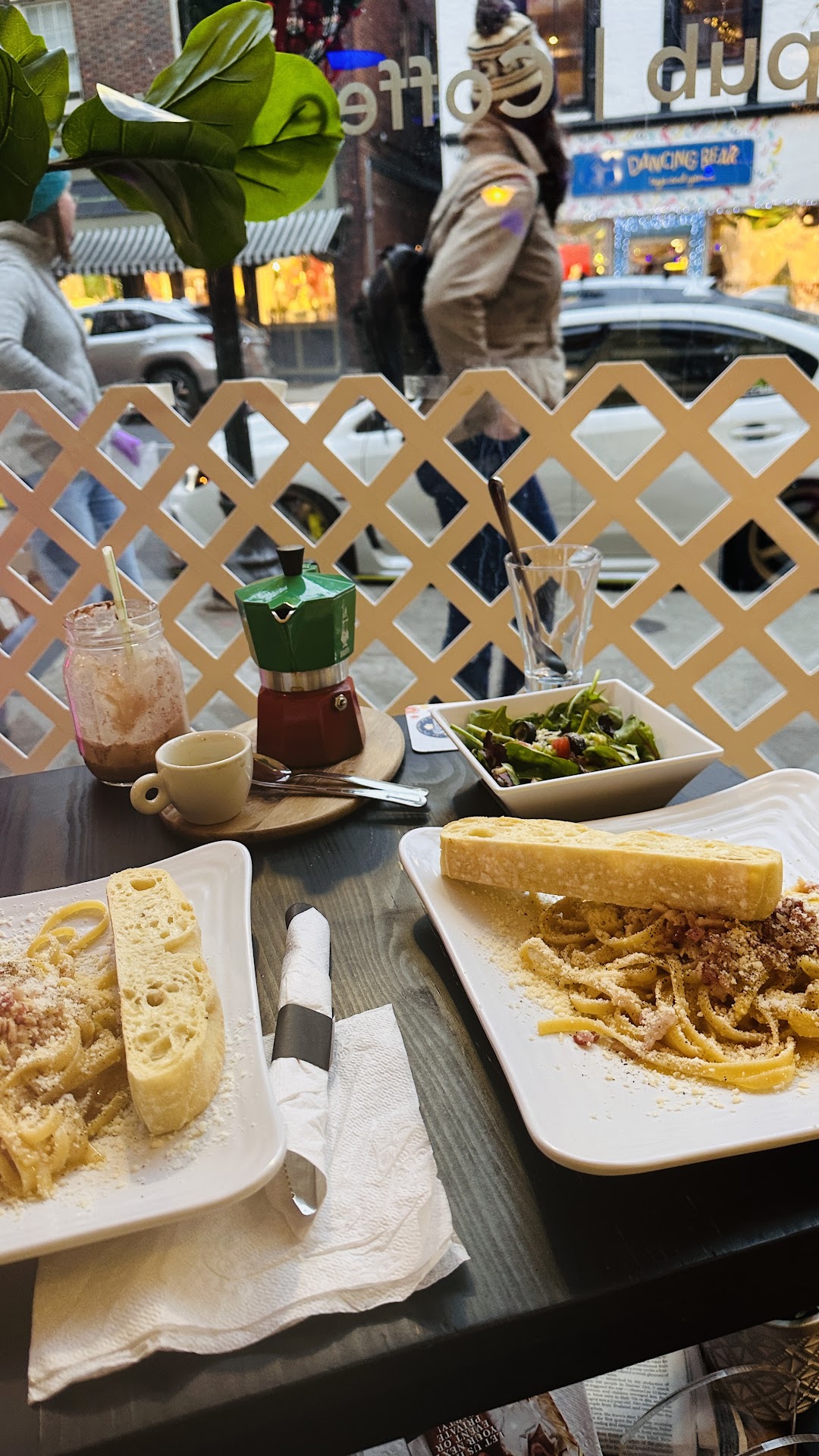 Who wants to feel rushed or like a nuisance for asking about different dishes? The owner took his time to explain everything to us in a beautiful way and absolutely sold us on dishes based of his wordings. The hot cocoa and expresso made its way to us within a few minutes while soon being followed by a delicious Burrata salad and then a wholesome Carbonara.