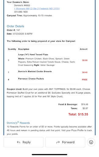 Read moreSeriously disappointing. The wings were the SMALLEST wings I have ever seen and I had 2 orders. The pizza...well it is not PA/NJ/NY hand made or hand tossed, so I shouldn't expect much, but it was for my kids and they were fine. My wife...she was disgusted and disappointed about the wings....I still cannot get over the wings. Customer service was ok, they threw in the sauces they thought I would like rather than ask me, so I swapped them out, but otherwise, they hustled, so my wait wasn't long. They have tables to sit and eat but because of the busy roadway and delivery drivers flying in and out, not exactly somewhere I'd recommend for a party larger than 4. Parking is limited with no walkways other than the narrow driveway in front of the Dominos...the location is in a commercial area. Sorry guys, this Dominos has...