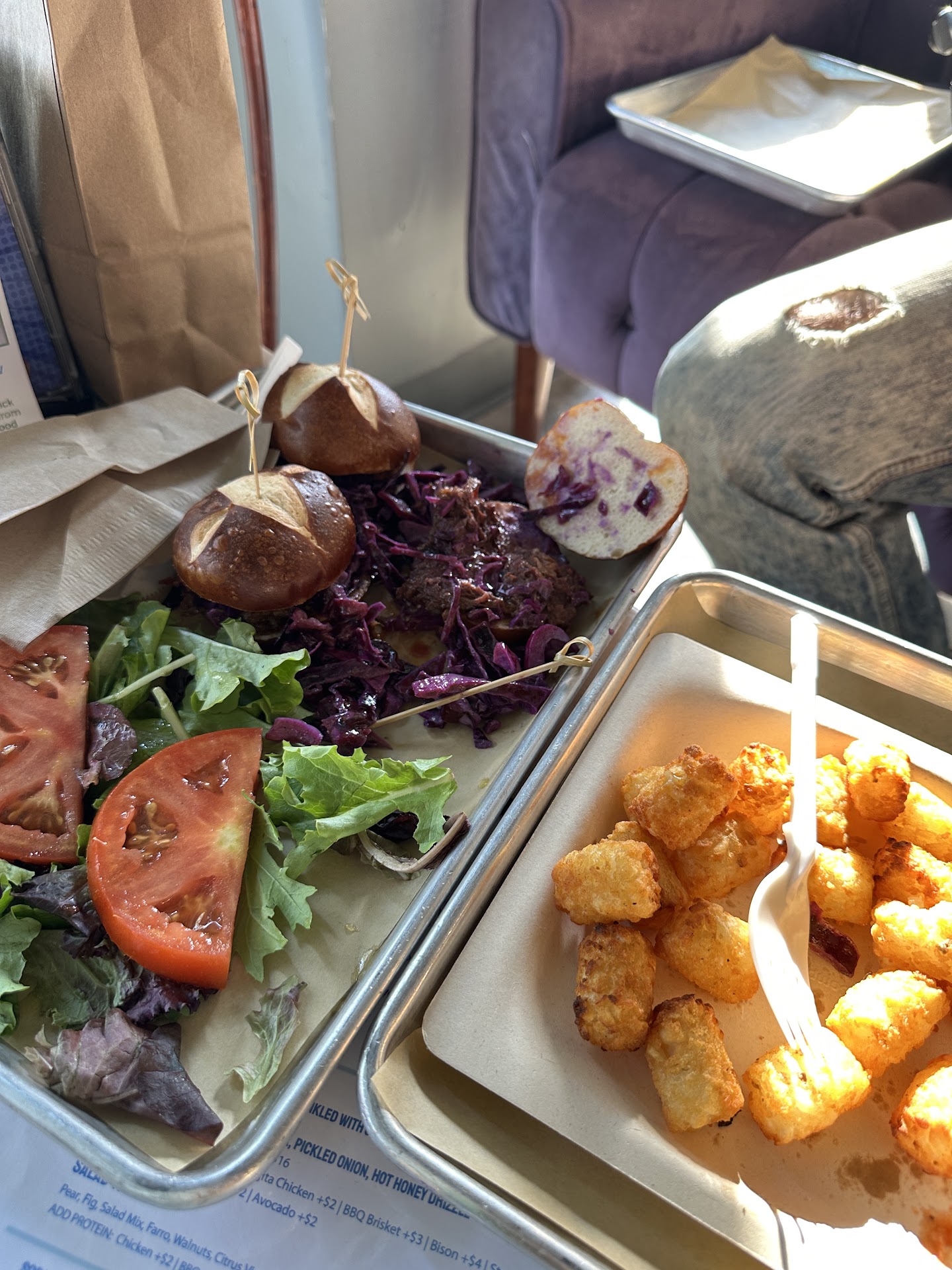 At the food counter, I asked about the breading on the cauliflower bites due to allergy concerns (corn) and was told they aren’t breaded, despite menu description. Okay, items get updated. I also ordered the bison burger in a bowl. I appreciate the bowl concept because I’m a bunless eater anyway but my partner was mildly irritated because this is not how it was portrayed when we previewed their options on google. No big though. Order food, give over number and full government (not comfortable with that — can’t figure out how to remove it from their system), take number and take a seat. Most of the seating is uncomfortable but they have some cute lounge-style tables. Partner ordered tots, the squeeze my brisket bun sliders, and monkey bread (which he was most looking forward to). We picked up our own food, even though the man made a big deal about a woman leaving her number behind — “it’s how we find you!” Find for… what? Not sure. You get a text and pick up the food. Don’t wait for it to be brought to you or you’ll be waiting a while.