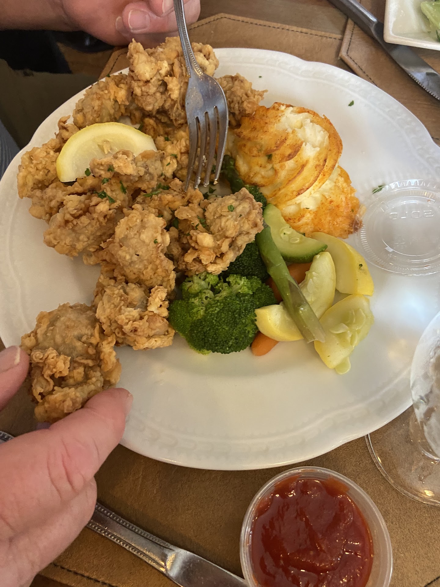 My wife and I made a reservation for 6:00 and got there and got seated early. We ordered a spiced pear vodka drink. Appetizers were jumbo lump crab stuffed mushrooms, oysters Rockefeller, and the roasted beet salad. For entrees we ordered the crab stuffed cod for her and sautéed chicken livers for me. I didn't see options for sides and both of our entrees came with a perfectly steamed fresh vegetable blend and homemade scalloped potatoes. It was hands down the best dining experience we have had in Frederick. In fact, we had a hard time remembering a better experience anywhere.