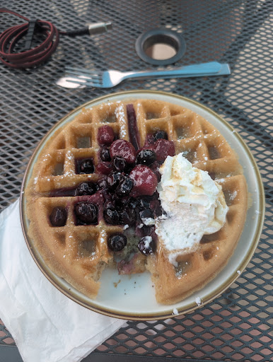 Read moreThis morning we walked to Gravel & Grind from our AirBNB. It was the GF waffles that led us there; my spouse hadn't had one in decades and we were hopeful based on other's reviews. We got there to find a line out the door (always a good sign) that moved pretty fast. We ordered a GF waffle with everything (fruit compote, butter, syrup) and a fully gluten waffle of the same. For drinks we got a Peruvian pour-over and a Chai Latte with almond milk. We agreed both of our waffles were EXCELLENT: crispy on the outside, fluffy and delicious on the inside. I don't know how they get the syrup on these without them turning to mush, but they did it! This was the best waffle I've ever had. It was, dare I say it, PERFECT. In fact, I at almost every bite before I knew it (very unusual for The Queen of "May I Have a Box!" My spouse said the pour-over was VERY good - this is high praise from my self-proclaimed Coffee Snob. I liked how the Chai Latte had a bit of a bite to it, likely from the clove infused in it.
