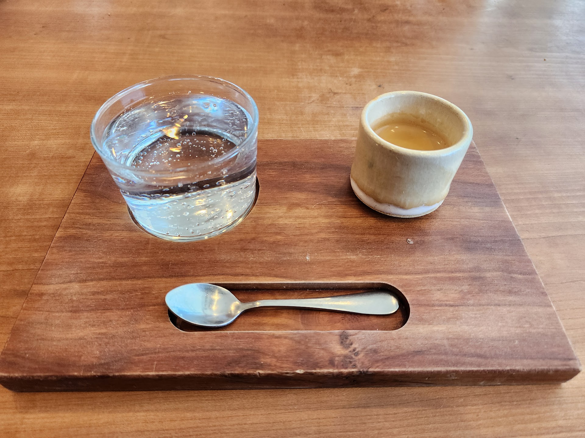 I also always get an espresso, which is always a great experience. Instead of just serving you a small cup of espresso, they also serve you a glass of sparkling water all on a wooden board with a spoon for stirring the espresso. I was very impressed with this method of serving espresso as well as the quality of the espresso itself. I was able to ascertain some fruity notes in the espresso, which makes me wonder if they were using a naturally processed coffee that day.