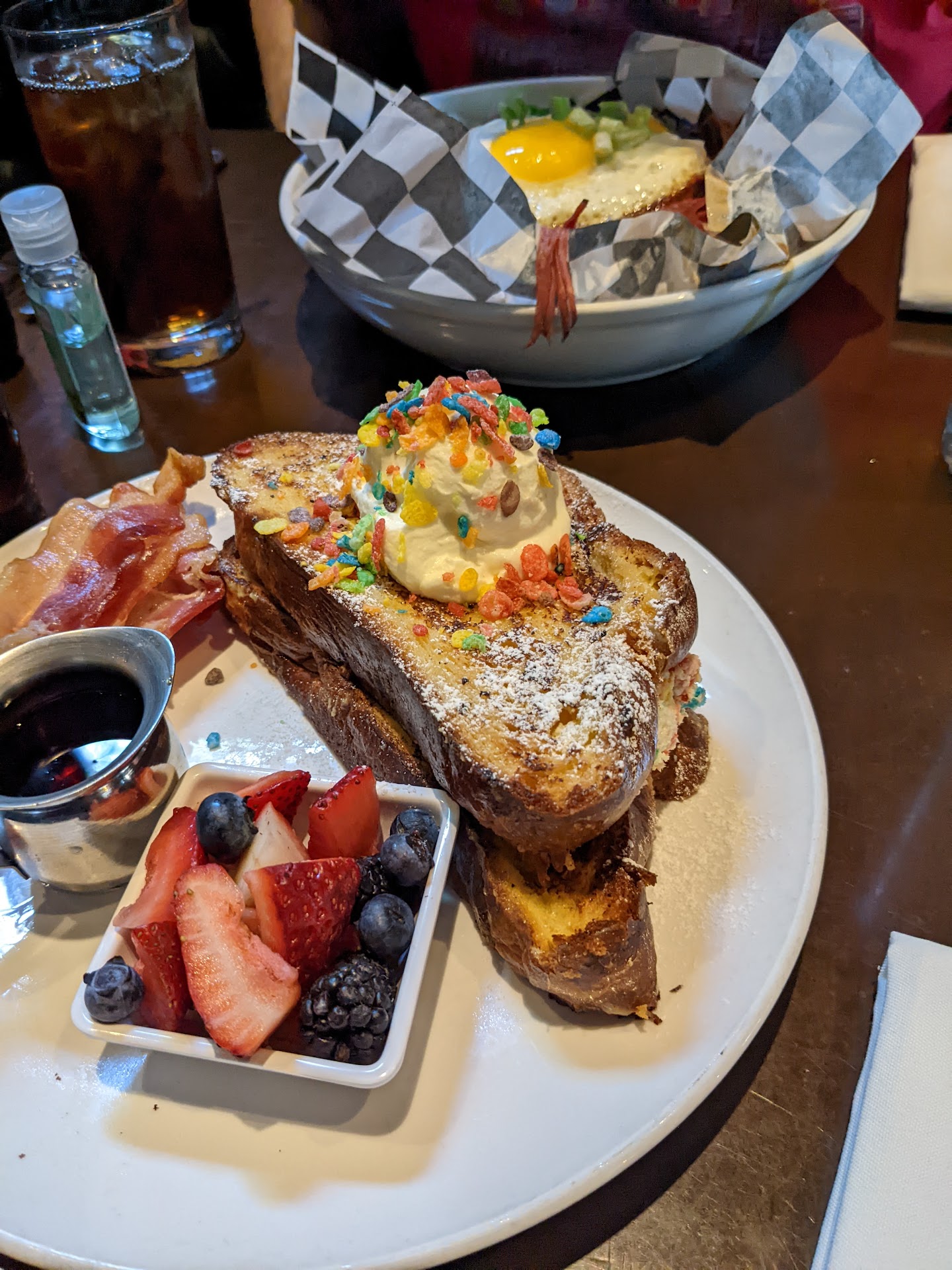 His Montreal Breakfast was his favorite poutine with egg on top and meat, that was closer to corned beef, but the portion size was insane! It was fun watching him eat his meat spaghetti we called it. 😂. As the one with the sweet tooth I had to get the fruity pebbles stuffed French Toast. I have had some really bad French toast lately and this was light-years the best in ages. It was cooked perfectly, sweet, a tiny bit crispy but also chewy, syrup was perfect. I really enjoyed the whipped topping with cereal on top, the cream in the middle was a little too much for me, but it was still delicious. Next time I may just ask for it unstuffed. For $40 for that meal, including unsweet tea, was a deal!