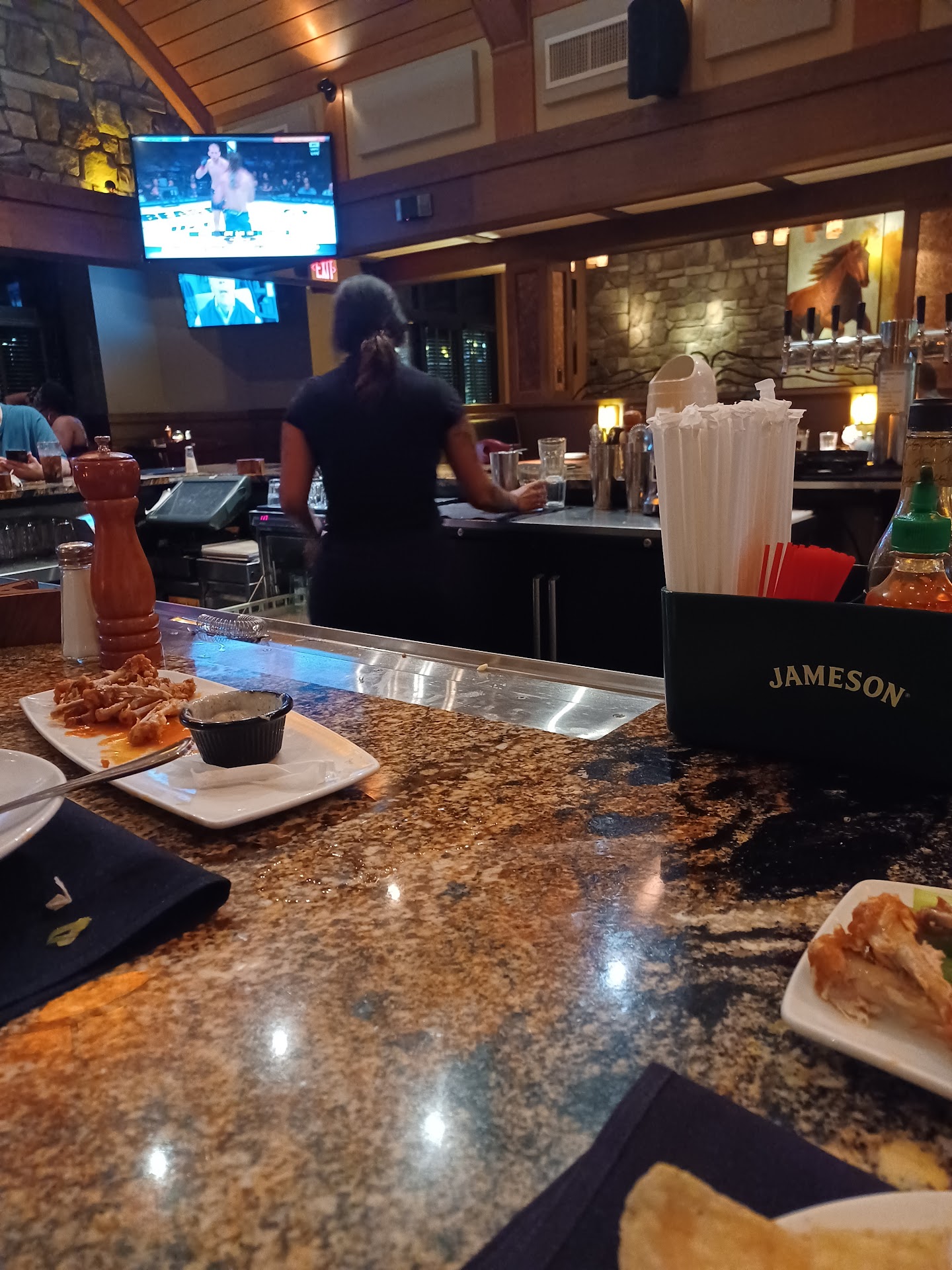 My companion and I came in on December 15, 2018 at 730pm. We approached the bar and saw two empty seats but there was leftover food still sitting there. Three women behind the bar were talking and I did interrupt them to ask if the people were still in the restaurant or if the seats would be available. Kaitlyn, red hair in a bun, looked at me and just said, "yes". I had to ask again because i didn't know if the people were still at the restaurant or the seats were available.