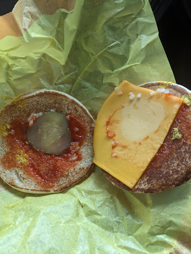 I pulled into the parking lot across from McDonald's to get my daughter situated and to eat my food. I picked up my cheeseburger... It felt lighter than normal. Once I opened it, I found out why. There was no meat inside. My first thought was "oh well, people make mistakes. I don't really need both of them anyways". So I opened the other one, again, meatless.