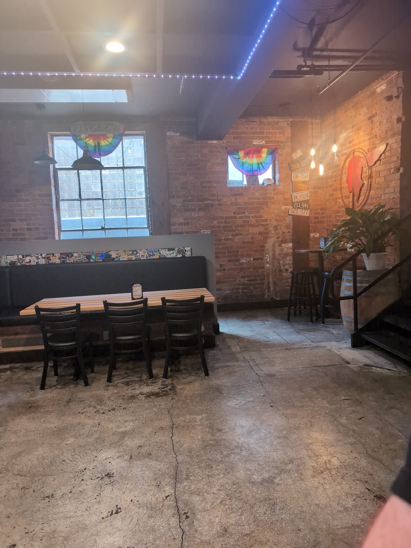 Pros: The decor was fun. LGBTQ flags abound. There is a rack of games you can play during your stay. There are beavers of all kinds incorporated into the decor. You'll see a photo of my favorite with rainbow sunglasses. We found a table/chairs and checked the QR code for what to order. My spouse walked to the bar to order the drinks - no line, no wait.