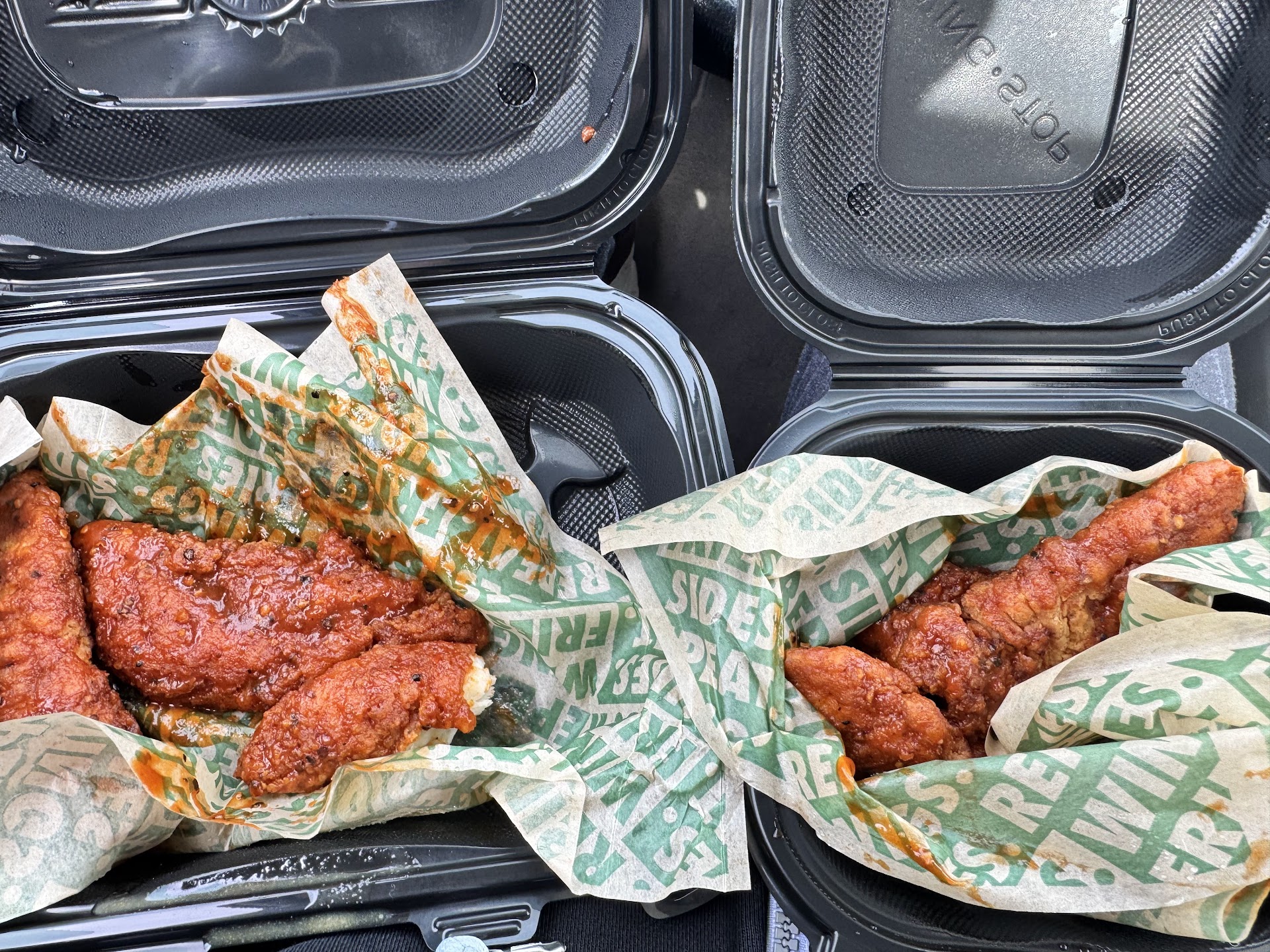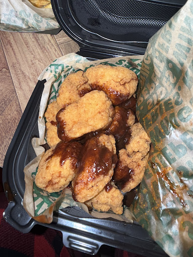 My husband and I ordered to go. When we opened our food the wings were a bit too fried for my taste, but my husband ate them. The chicken tenders, the smallest tenders I've ever seen. Not only that, they tasted like they were dredged in salt. Four wings in the trash. The tenders were so small and over fried that the chicken was basically jerk like. You're a chicken place. You just do chicken. Do right by the chicken...