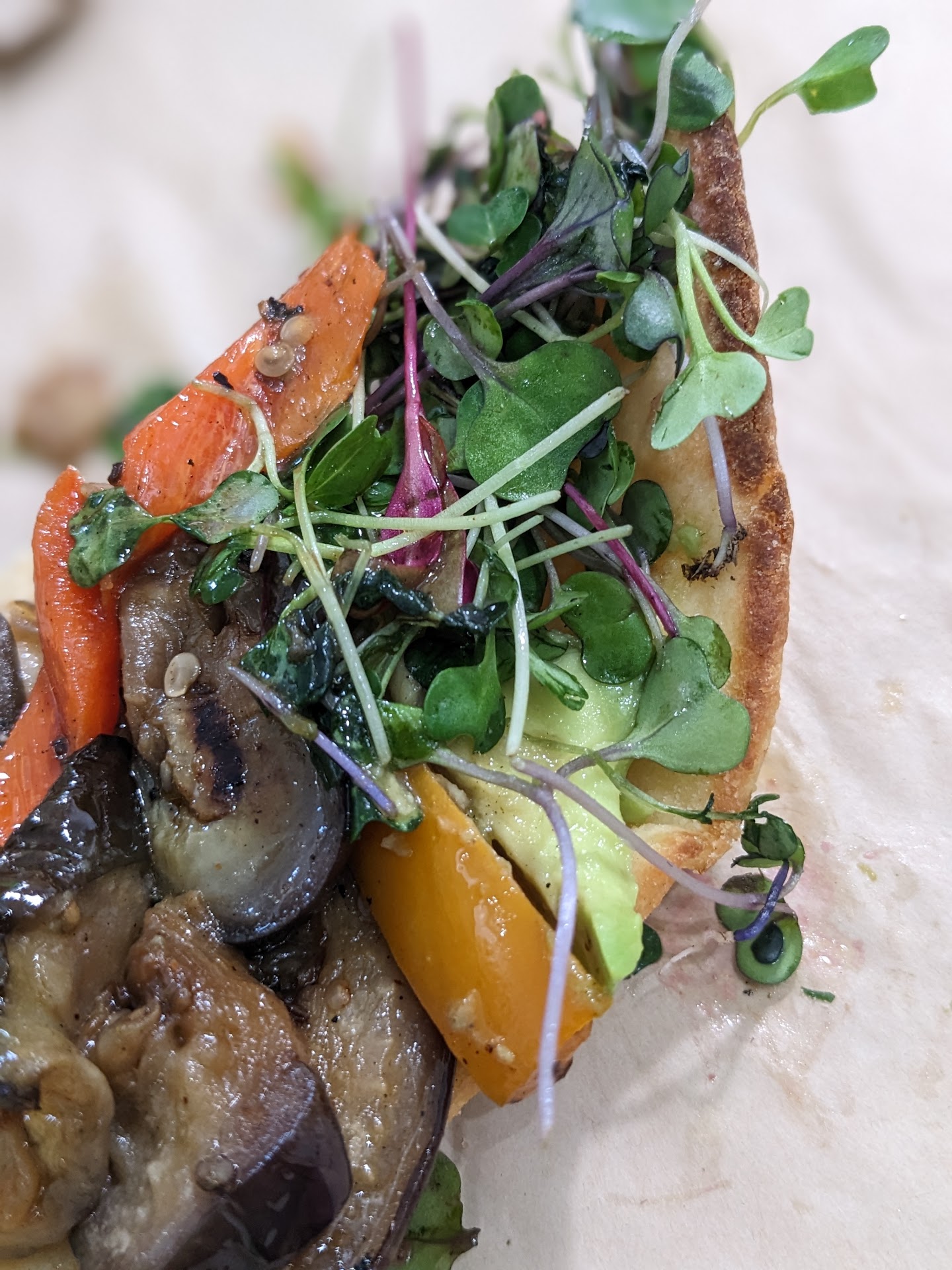 The bread on both sandwiches was super tasty, chewy but with the crunch in the right spots. The veggie had roasted eggplant, zucchini, roasted red and yellow peppers, avocado and greens. I skipped the onion and Peri Peri as I can't do much spice. It was delicious. Crunchy, homemade, warm and delicious. I'll most likely add a slice of cheese next time.