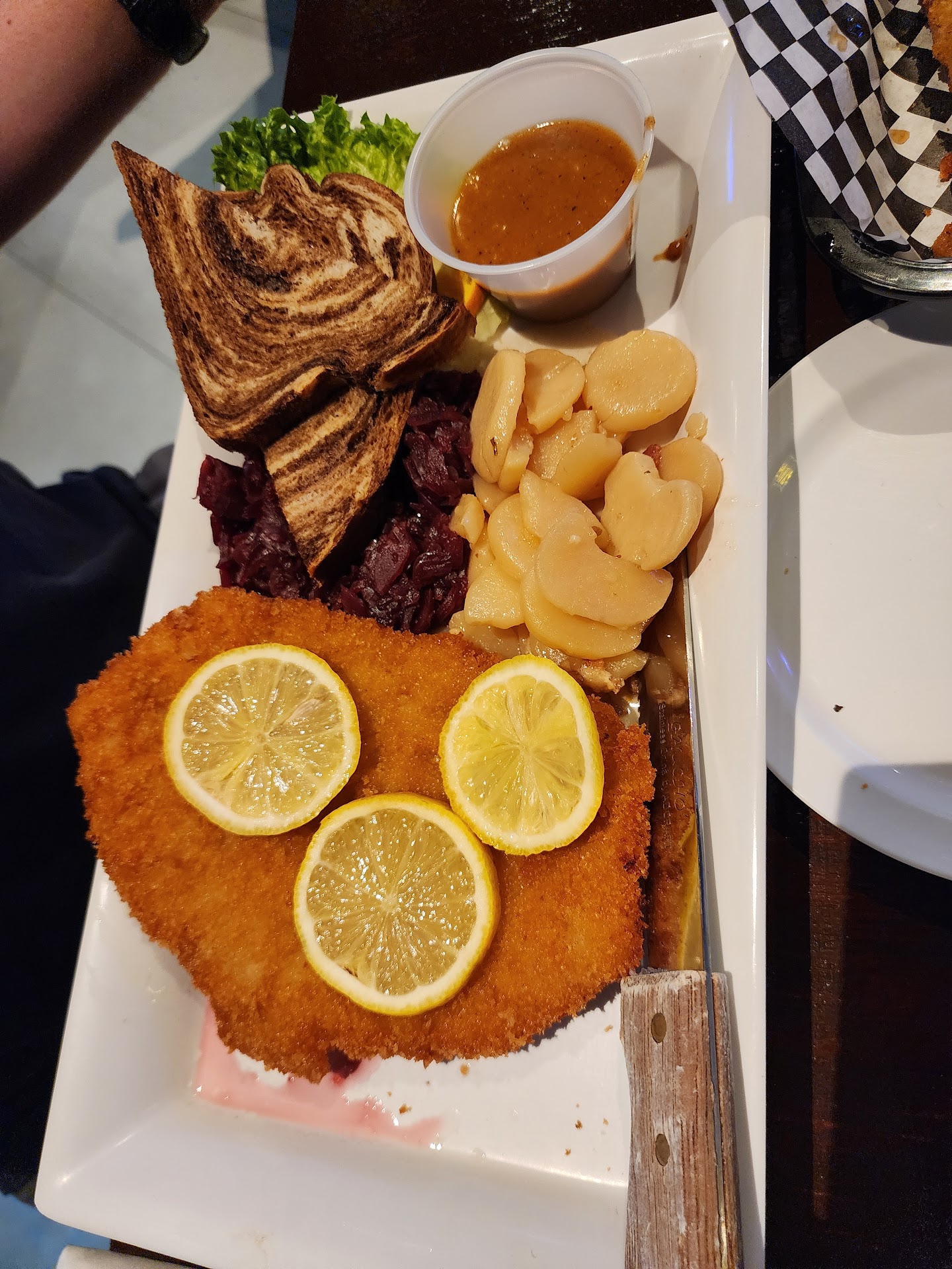 The Pepper Schnitzel entree ($16.99) is a breaded pork cutlet, topped with red and green bell peppers, tomatoes, onions, and paprika sauce. Nothing really out of the ordinary here, but the pork is nice and tender. The paprika sauce is very flavorful, but too heavy on the salt side for me. The same goes for the grilled veggies that comes with it - just too salty. The side salad it came with was awesome. Real greens (not plain old iceberg lettuce) and it included tons of chopped tomatoes and was covered with shredded cheese.