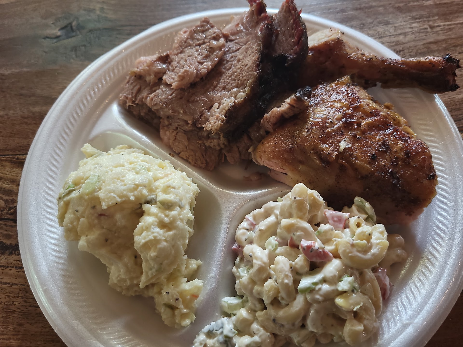 Read moreI had high hopes for good central Texas bbq. I was left disappointed. The menu has your standard fair and they do offer breakfast. I ordered the two meat plate with moist brisket, sausage, potato salad, and green beans. The first red flag went up when the person who took my ordered asked me what I meant by "moist" brisket. He asked if I meant "fatty" brisket... To which I said yes. The second red flag went up when I saw a bottle of "sweet baby Ray's BBQ sauce" next to the homemade sauce. Why would a bbq restaurant put out a bottled sauce to compete with their own sauce? The third red flag went up when my plate arrived. The small portion of fatty brisket could have fit in the palm of my hand. It had no smoky flavor and no smoke ring. It looked like it had been cooked in a crock pot. The sausage was sliced into paper thin slices and was very dry. The potato salad was bland and needed salt. The green been on my plate were swimming in juice, which spilled into the potato salad. If you are going to serve green beans, please drain them before putting them on the plate.