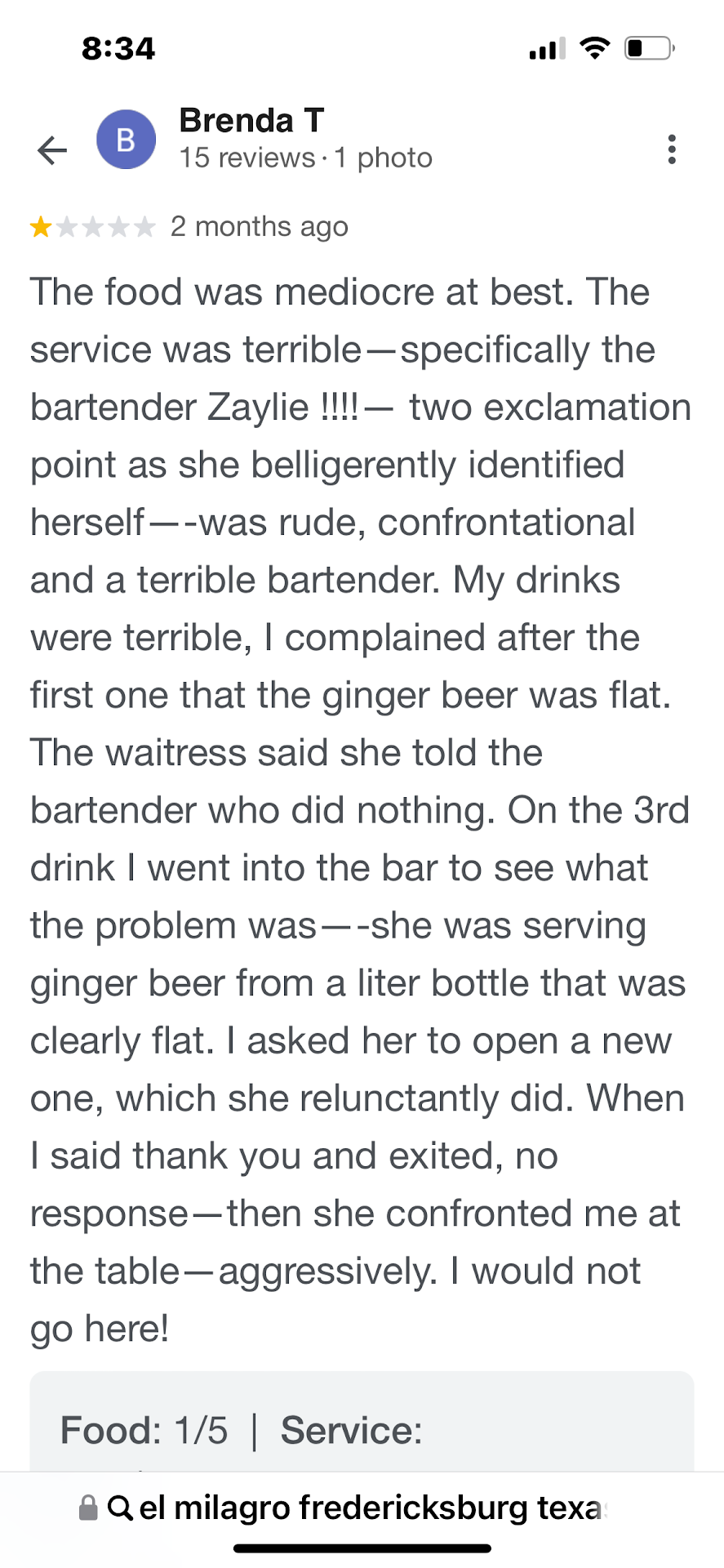 Read moreThis place is a joke! we were visiting from Austin as we always do for our yearly Fredericksburg trip and that was one of the many places that we chose to hangout at while we were there for the weekend letâs just say they are racist and rude the bartender was aggressive got in my face yelling cussing, screaming, because her drinks were gross, and I returned them All in all, letâs just say that formal complaints are to follow and I will never step foot in that place again if you want good food and good drinks that is definitely not the place to visit I gave it one star however it deserves negative 5 stars! Trust me, keep your money and donât waist your time going there! And let me add to Zara Stratton review below ., you were the waitress that provided terrible service and thought it was ok to slam down the receipt in front of my husband face on the table! I see you have yourself 5 stars laughable! I sent two nasty drinks back made by what I see now on yalls fb page is your sister I didnât even drink them so you claiming I wanted free drinks .. again laughable⊠my husband was inside trying to pay as your sister the bartender was making me exit and processing to follow me yelling and cussing not only to me but our entire group even the half great side ⊠no one goes to Fredericksburg for a weekend not expecting to spend money of course we spend money and we have no problem doing it so your claim on wanting free drinks .. laughable they were trash nasty but yall service was Trashy! Go back and look at the cameras reflect on yalls behavior oh who am I kidding other reviews on here talk about not only the terrible experience and service but the nasty drinks made by Zaylie! And yes racist against...
