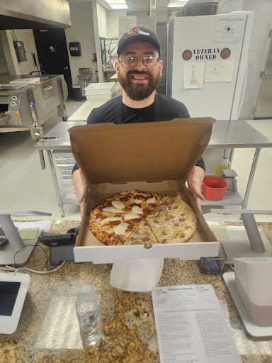 As someone who worked in the pizza industry I'm picky, I know about how long it takes to make pizza, and so I went with this place. I immediately knew I was going to get Fredericksburg's Wurst Pizza, and my coworker got the Feel the Verne. Our guy in the picture made that sexy pizza 1/2 and 1/2 of our orders, and has something to be proud of.