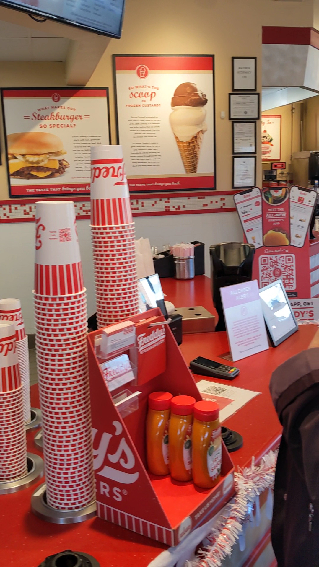Read moreWas in the mood for hot dogs so I did a little Google search and Freddy's popped up. Looking at the pictures I actually thought it was a local place in Fredericksburg but it seems to be a national chain at least that's what the cashier told me. I'm a big Chicago dog fan and I was intrigued that they had their own Freddy's version of it. I got a combo meal with the Chicago dog and their shoestring french fries which I made into chili cheese fries and a Diet Coke. After you make it water they give you a little slip and you can take a seat and wait for them to call your number. The place kind of has a 1950s Vibe with red and white checkerboard colors throughout. They have a soda dispensing machine that you get to pick your own drink and fill up with free refills. Food talk about 10 minutes to get which wasn't too bad. The Chicago dog is definitely their own version of it and doesn't have some of the traditional things oh, but it was actually very good. One of the things I think I even preferred over a poppy seed bun was the butter toasted bun. It doesn't have a little Chili Pepper on it but it was really good. The shoestring Fry's we're fried to perfection and they stayed pretty crispy, at least for a while with the chili and cheese on top of them. They also had a couple of different dipping sauces that you could grab when you go pick up your food. Overall I was very impressed with the whole meal and setup of the place. They have a drive-thru and have a number of different burgers, ice cream and shakes you can choose from. Hopefully they'll open one up a little closer here in the Richmond area, but if you're anywhere near one I would highly recommend...