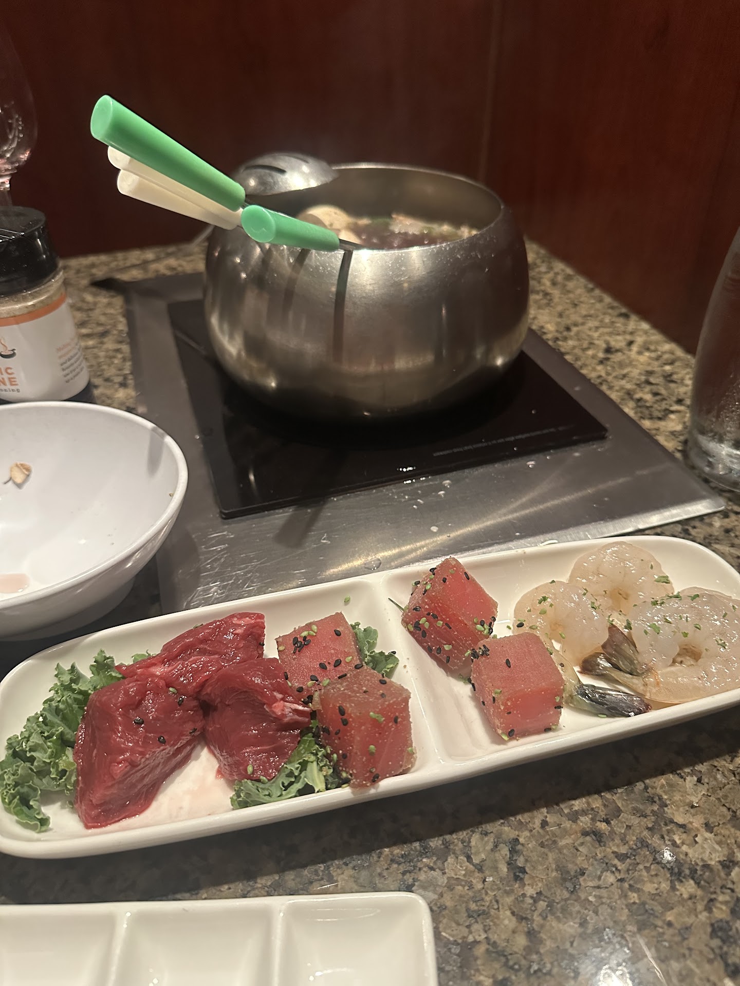 Read moreOur visit was the first time my husband had been to a melting pot. It was our first anniversary, and things could not have gone any better. Our waiter, Nolan, was absolutely fantastic: knowledgeabe, courteous, and attentive (our receipt says Nolan, although the credit card presentation holder said "Ryan"). If we were out of something or had a question, we did not have to wait long at all to be waited on. We chose to do the Date Night special, one of many fine specials this melting pot has. The night went well as we started each course. The salad was an excellent transition into the third course even though we could have kept eating the wonderful cheese fondue forever. Honestly, if you have a sweet tooth like my husband and I, save a little more room than you may want to for dessert ( I say "more than you may want" because you will most likely wish to eat more and more, ignoring dessert, if you choose a third course).