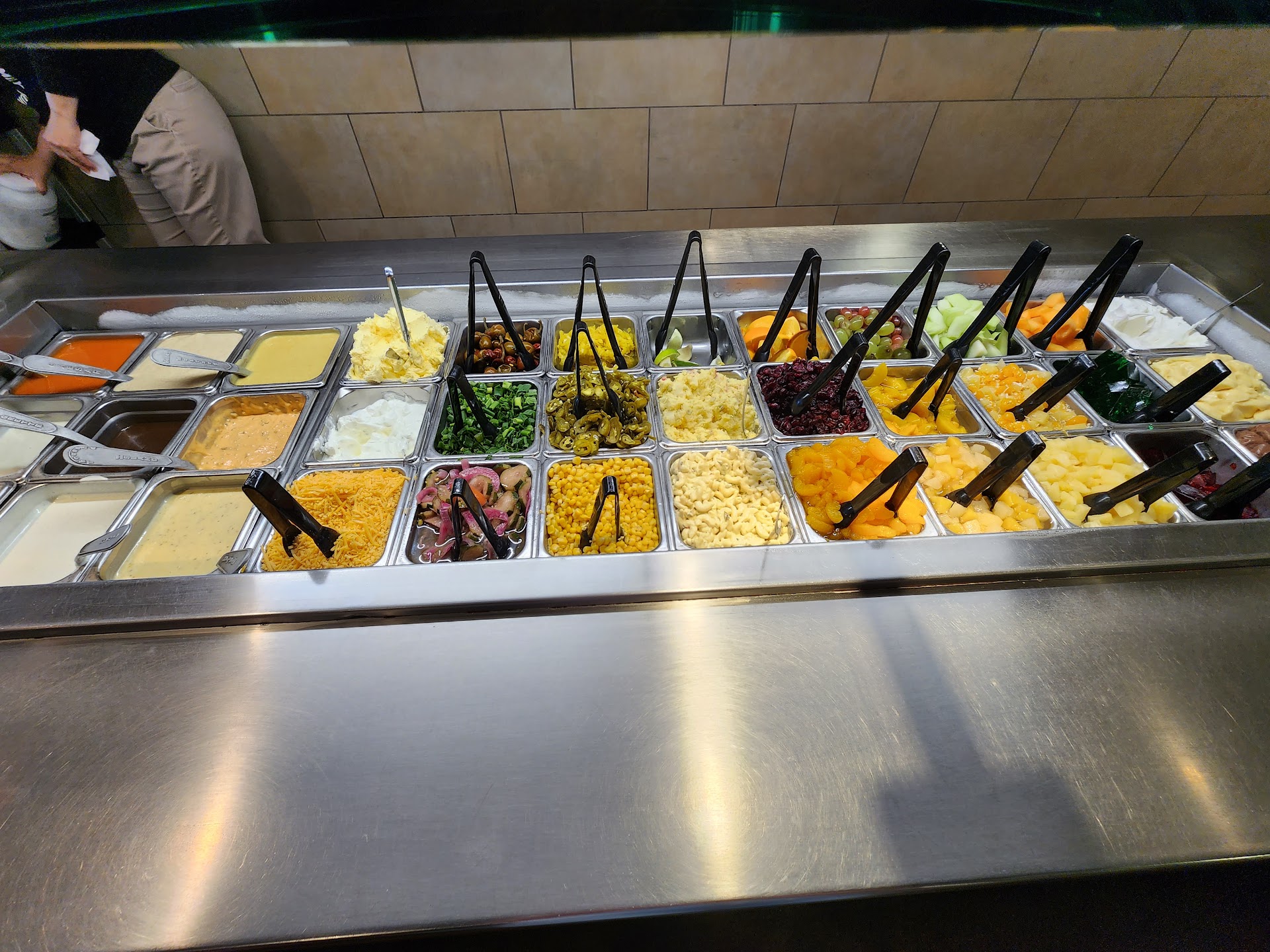 Food: awesome salad bar (lettuce, tomatoes, egg, okra, cheeses, bacon bits, ham, diced onions, fruit, baked potato fillings, whipped cream, jello, dressings, etc); mac & cheese; pasta and sauce; cheese bread; pizzas; desserts. I loved their salad bar & saw multiple guests come in and simply order the salad bar to-go (I think it may be a lesser charge). Their mac & cheese was good. I also enjoyed their strawberries & grapes. My husband liked their pepperoni & meat pizza, cheese bread. Tried their cinnamon rolls but they were just too sweet for me.