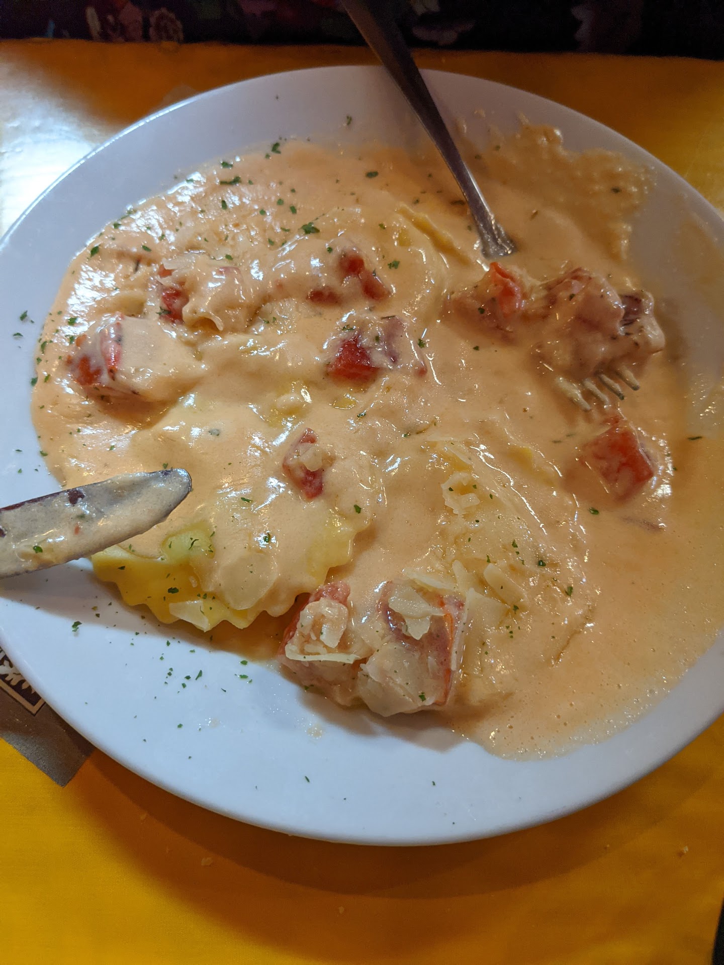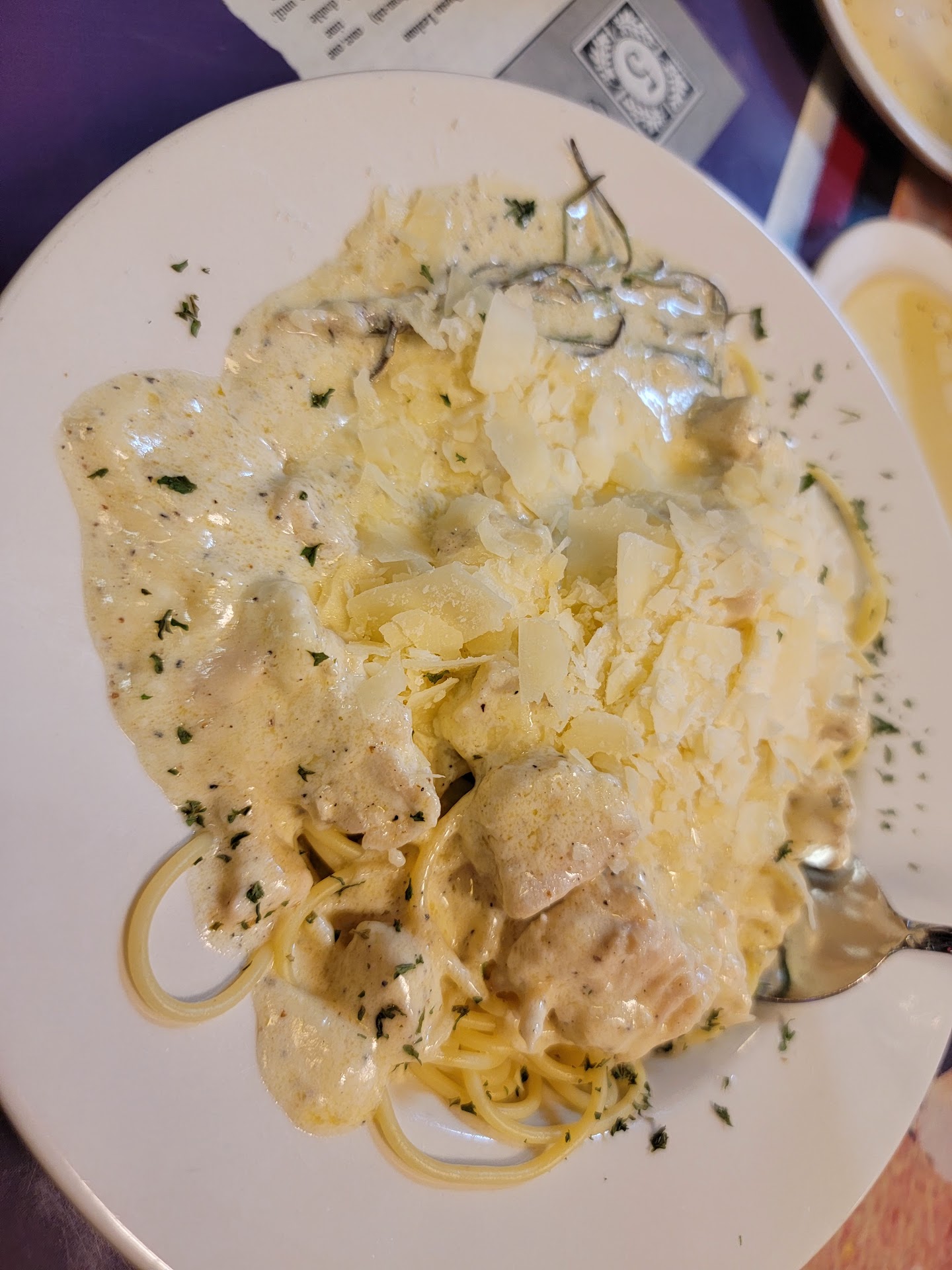 Food: lasagna, alfredo, spaghetti, ravioli, salads, calamari, picatta, marsala, eggplant, etc. Small pasta portions were not all that small- we had a small to-go box in the end. They give complementary bread and it was delicious with their house made olive oil (which I think you can purchase a bottle if you want). We ordered the #3 original and the flavors were good with the penne pasta. Plenty of creamy sauce and good garlic flavor. Also got the #6 lemon alfredo and it was delicious- I would go back again for this! Creamy, a little acid from the lemon, with spaghetti noodles.
