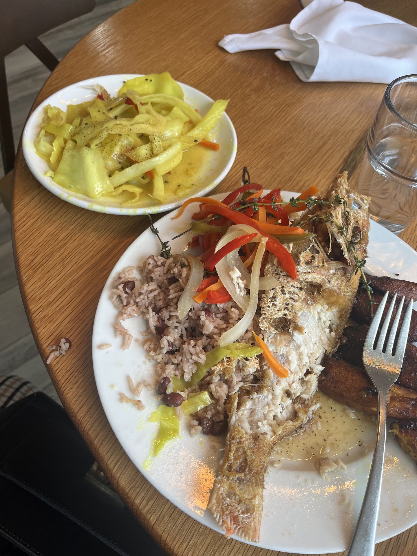On our second visit, for an entree my wife had the Jerk Shrimp with Rice & Pigeon Peas, and Plantains. I had the Deep Fried Red Snapper with Rice & Pigeon Peas, and Plantains. We had water with no ice and lemon to drink. The Jerk Shrimp dish is the correct portion and the appropriate size, perfectly plated and was full of great flavor! There plantains are some of the best that I have had including my many visits to Jamaica. I recommend having the Salmon prepared to medium temperature. On this visit, my Deep Fried Whole Red Snapper dish was personally prepared by Chef David and it looked, smelled, and tasted delicious. Again, both of our meals were very delicious and the perfect temperature.